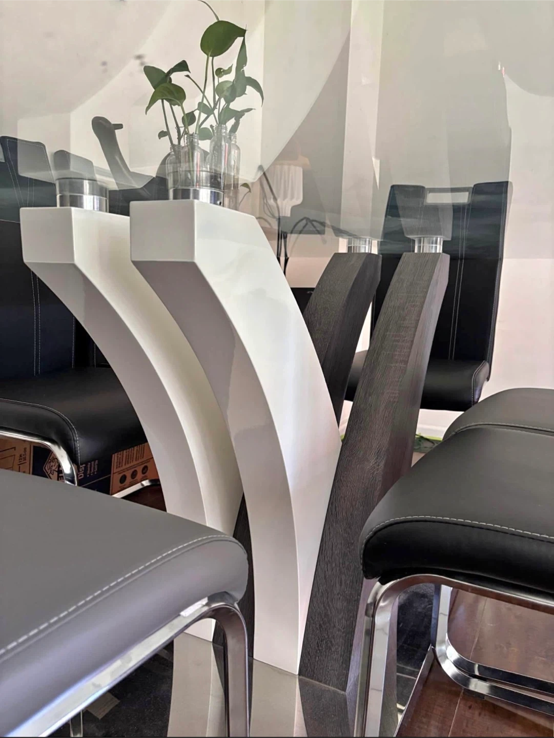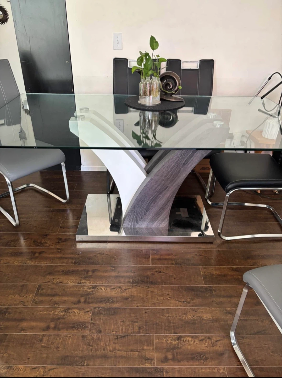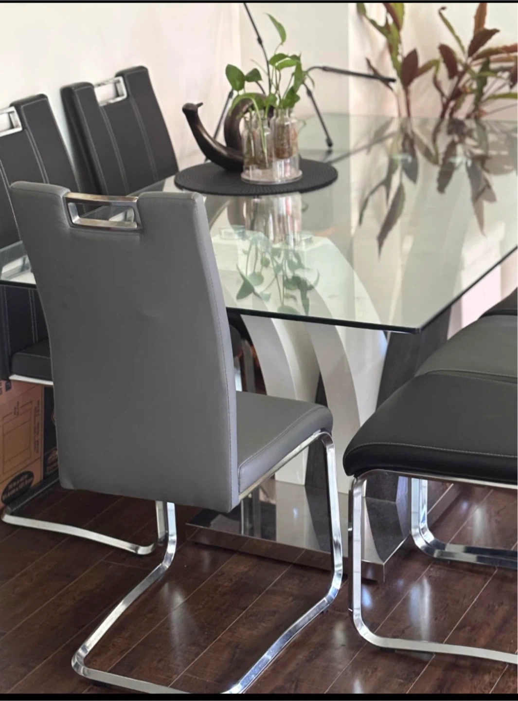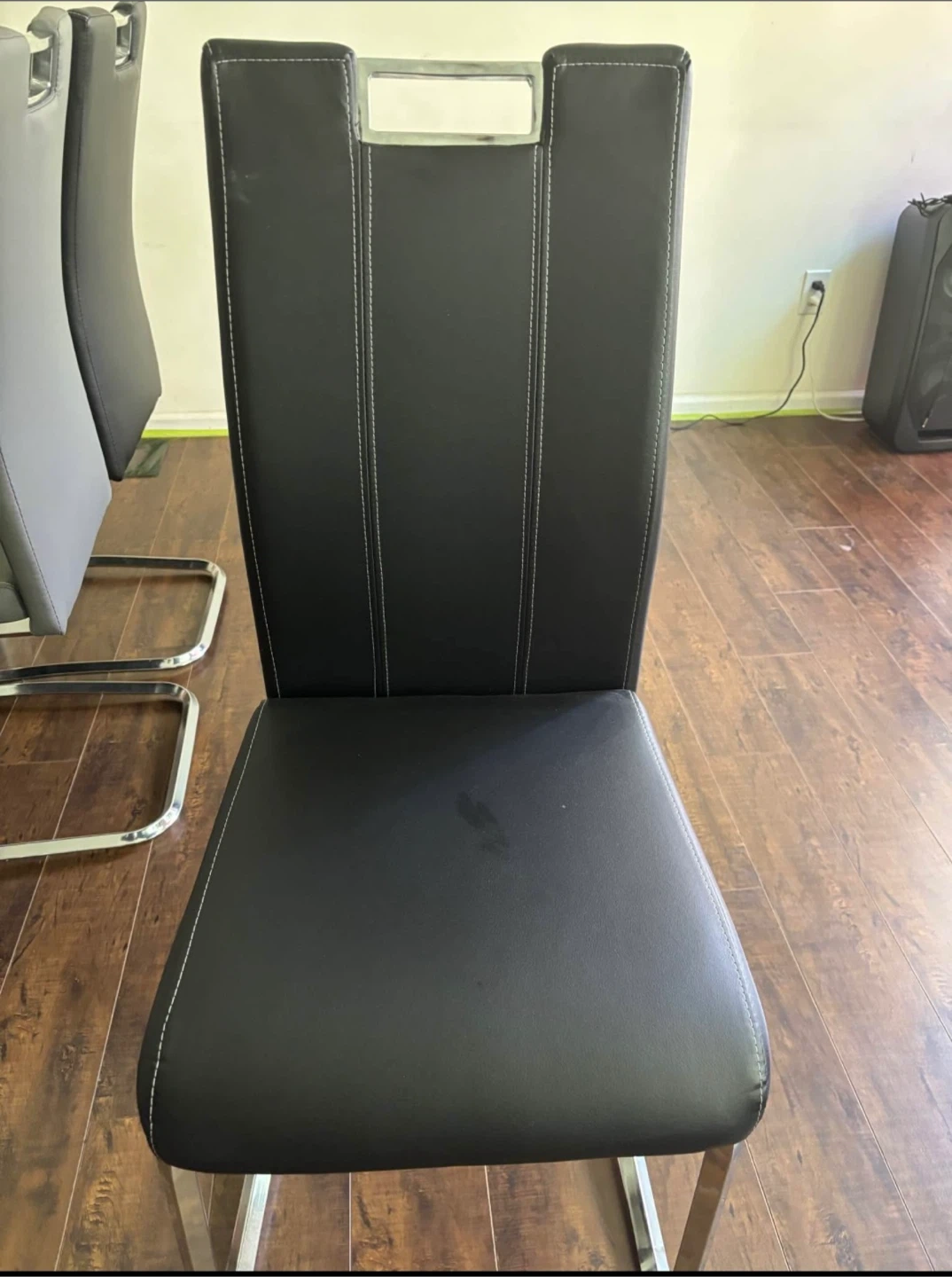 Selling a set of six dining chairs. They are a sleek black and grey colour, with a modern design. The chairs feature a comfortable seat and a stylish metal frame. They would look great in any dining room!