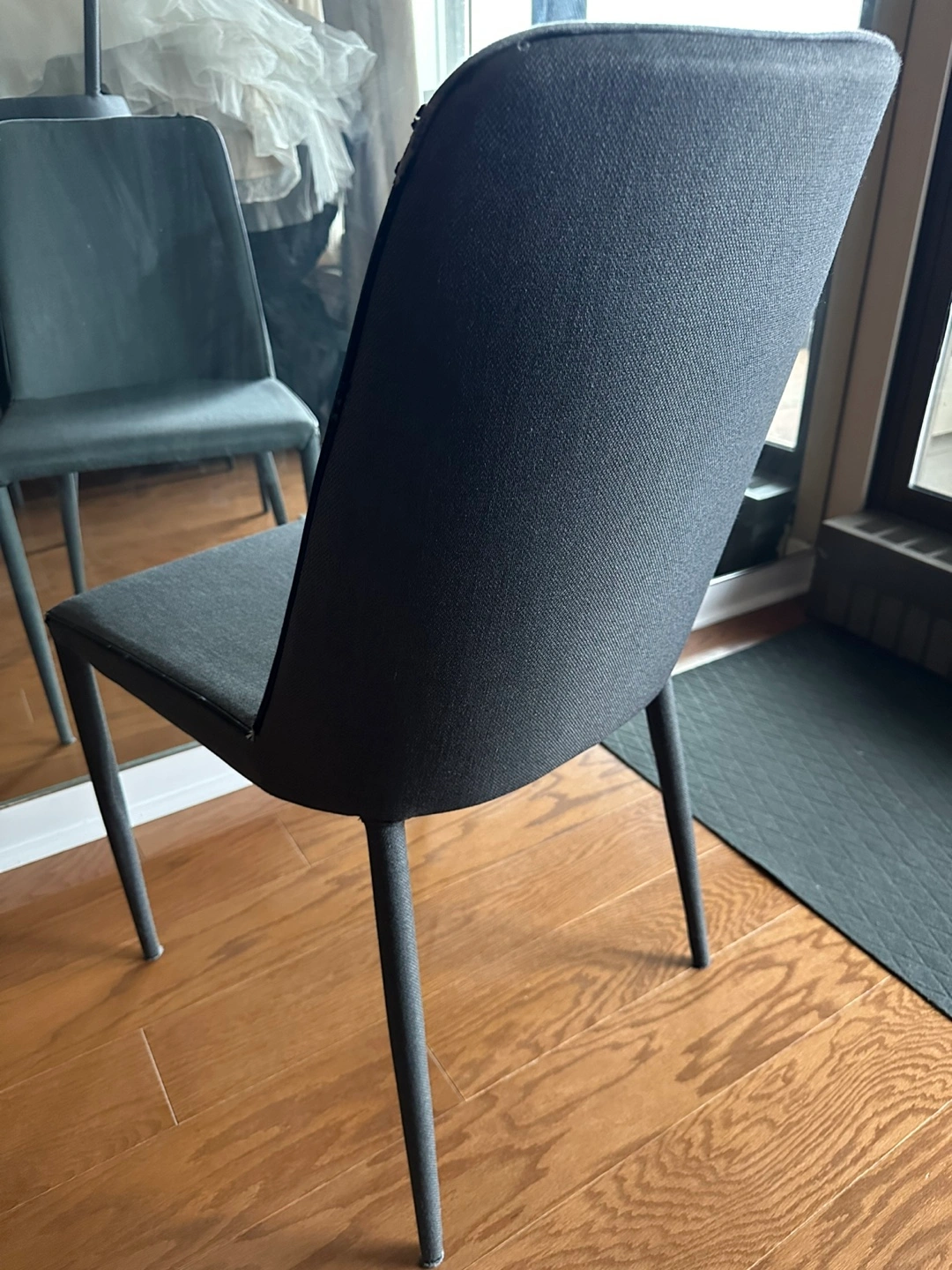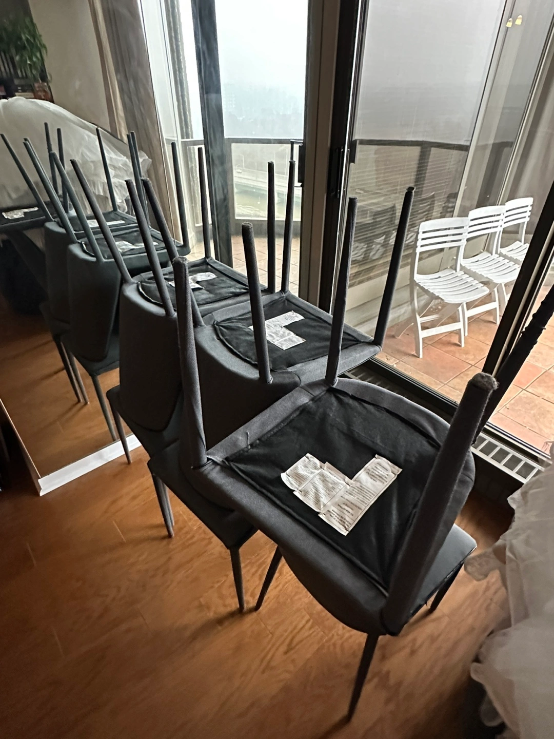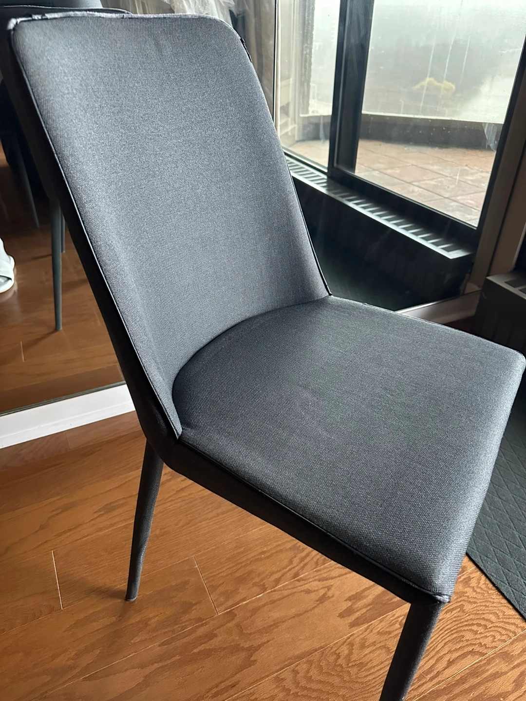Selling a set of six dining chairs. They're in great condition and ready for a new home! The chairs are upholstered with 100% polyurethane foam, offering a comfortable seating experience. Perfect for adding a touch of modern elegance to your dining space