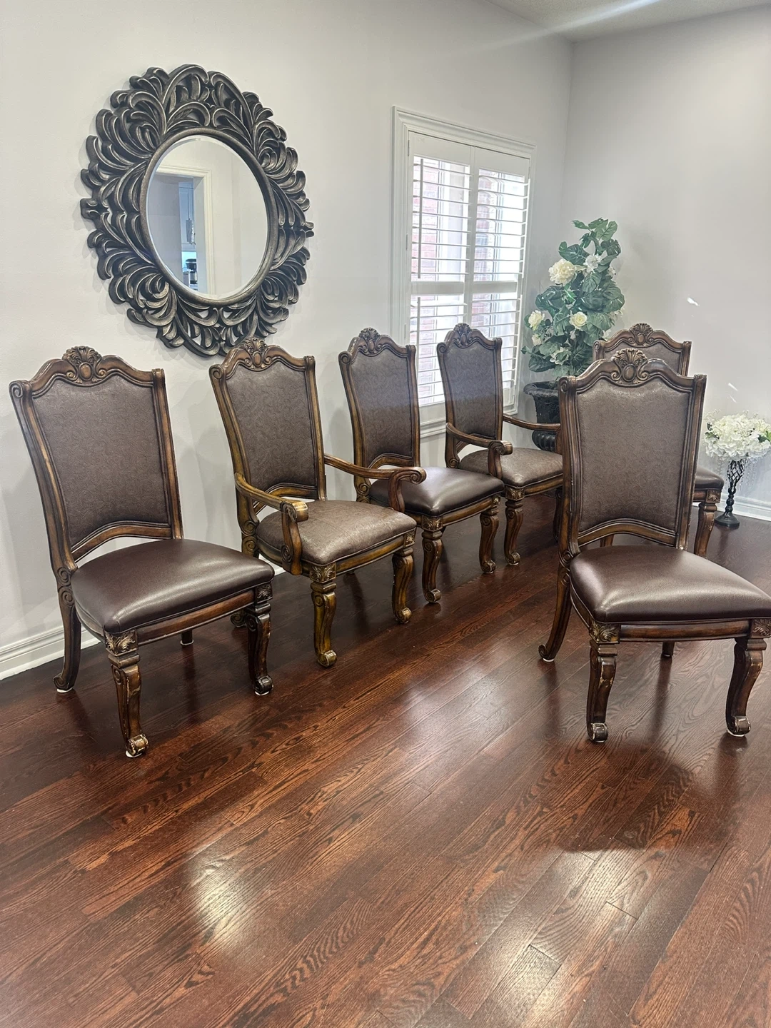 Selling a set of six dining chairs. They have a classic design with ornate wooden frames and upholstered seats and backs. They're in good condition and would look great in any dining room! Pure Egyptian wood great condition got brand new upholstery 3 months ago If the Ad is up it’s available, first come first serve. $80 each chair