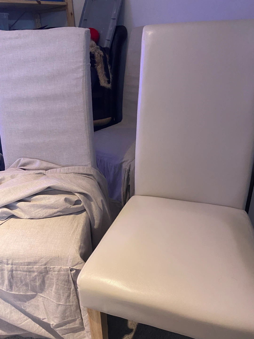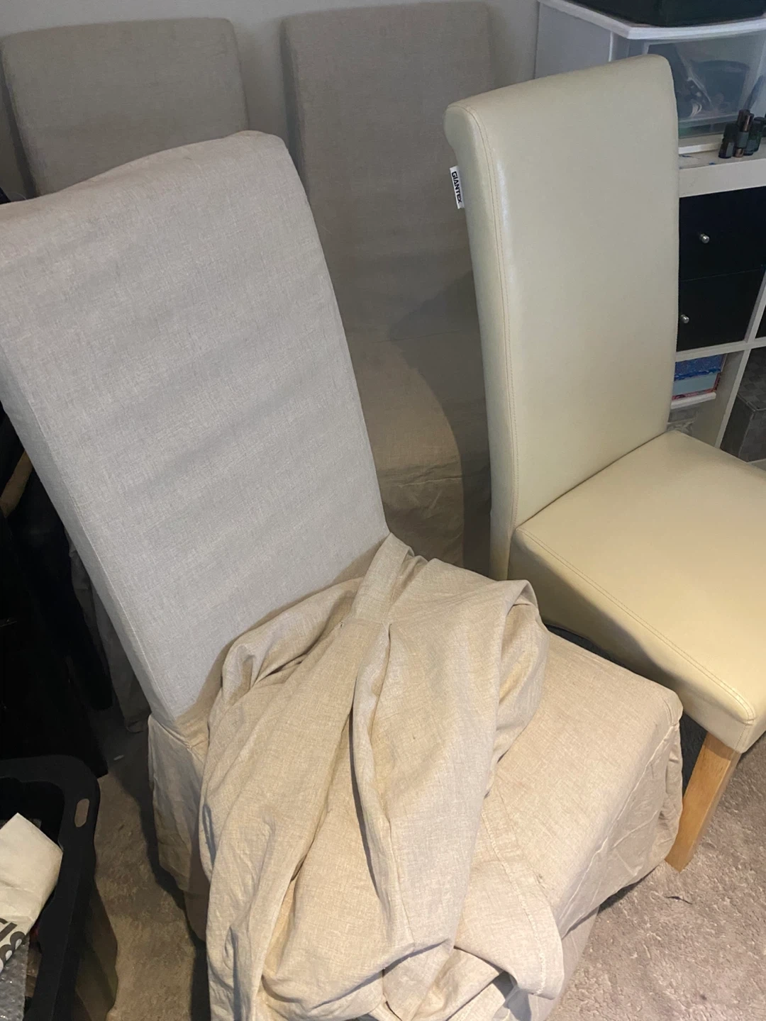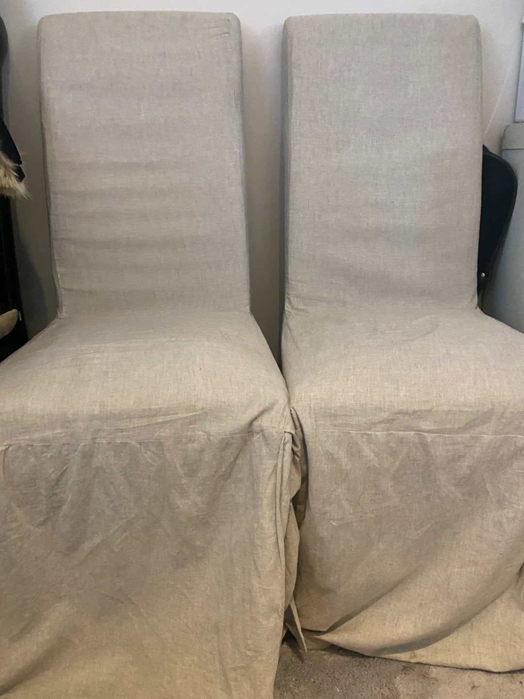 10Selling these 4 lovely dining chairs! Linen covers included! They're in great shape and would look fantastic in any dining room. The neutral colour ensures they'll match any decor. Perfect for adding a touch of elegance to your home!
