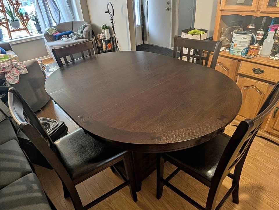 0Counter height dark brown table with two leaves and 4 chairs. Picture is with leaf installed Minor scratches Dimensions Width: 42" (106.7 cm) Height: 36" (91.4 cm) Depth: 42" (106.7 cm) Pickup @ Hurontario & Wanless
