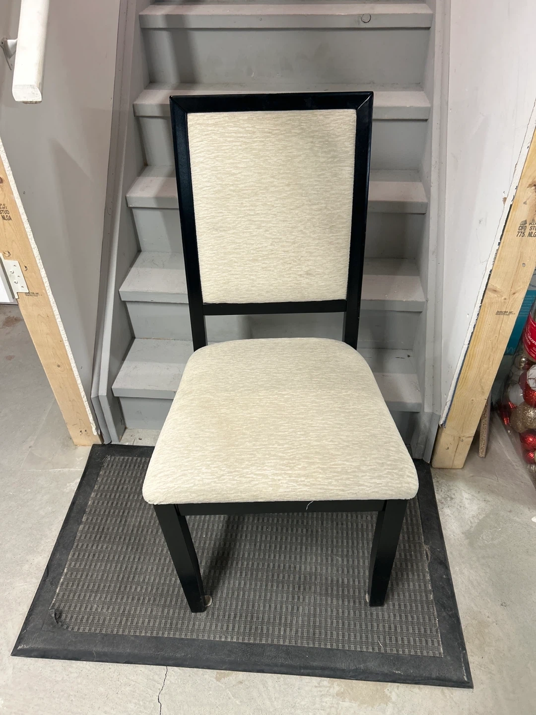 Here's a dining room chair with a black frame and cream-coloured fabric seat and back. It's in decent condition and would look great in any dining space! The chair is comfortable and perfect for everyday use or special occasions. 5 chairs available.