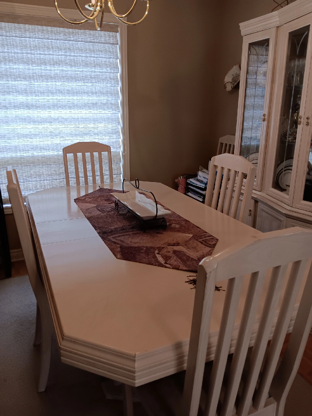 Selling dining room table with 2 leafs for extension and 6 chairs in a bleached oak colour. The table has a wooden frame and chairs seats are fabric. The table is in good condition and chairs are in fair condition. This set would be a great addition to any dining room or kitchen. This set would also be a good piece for refurnishing!