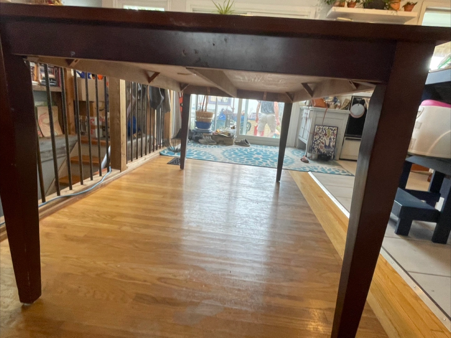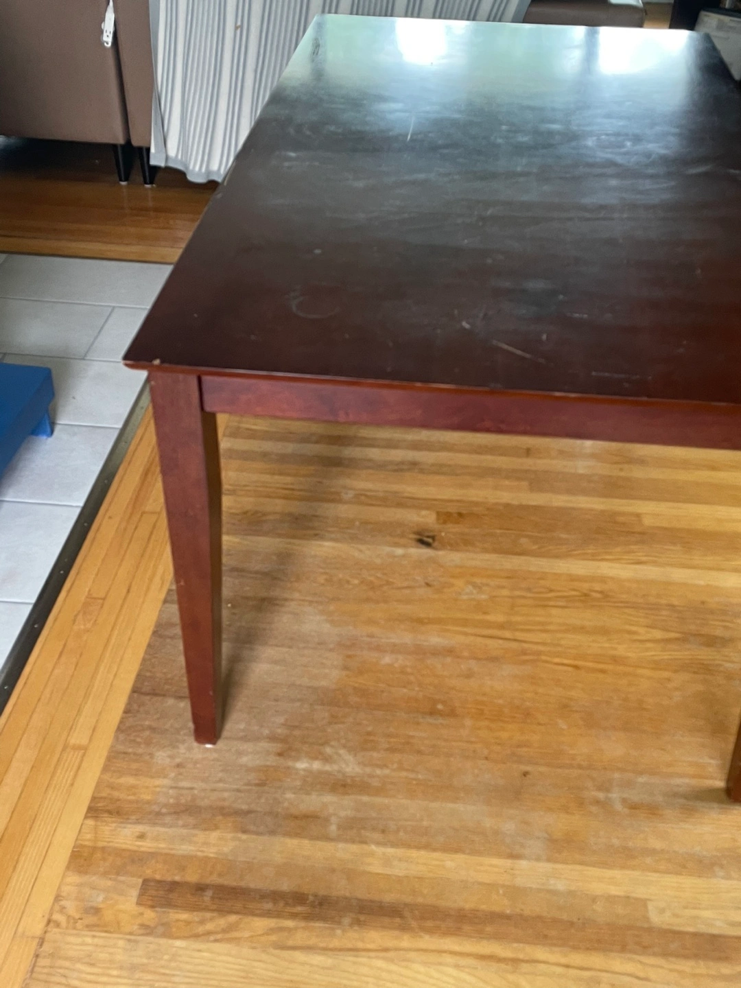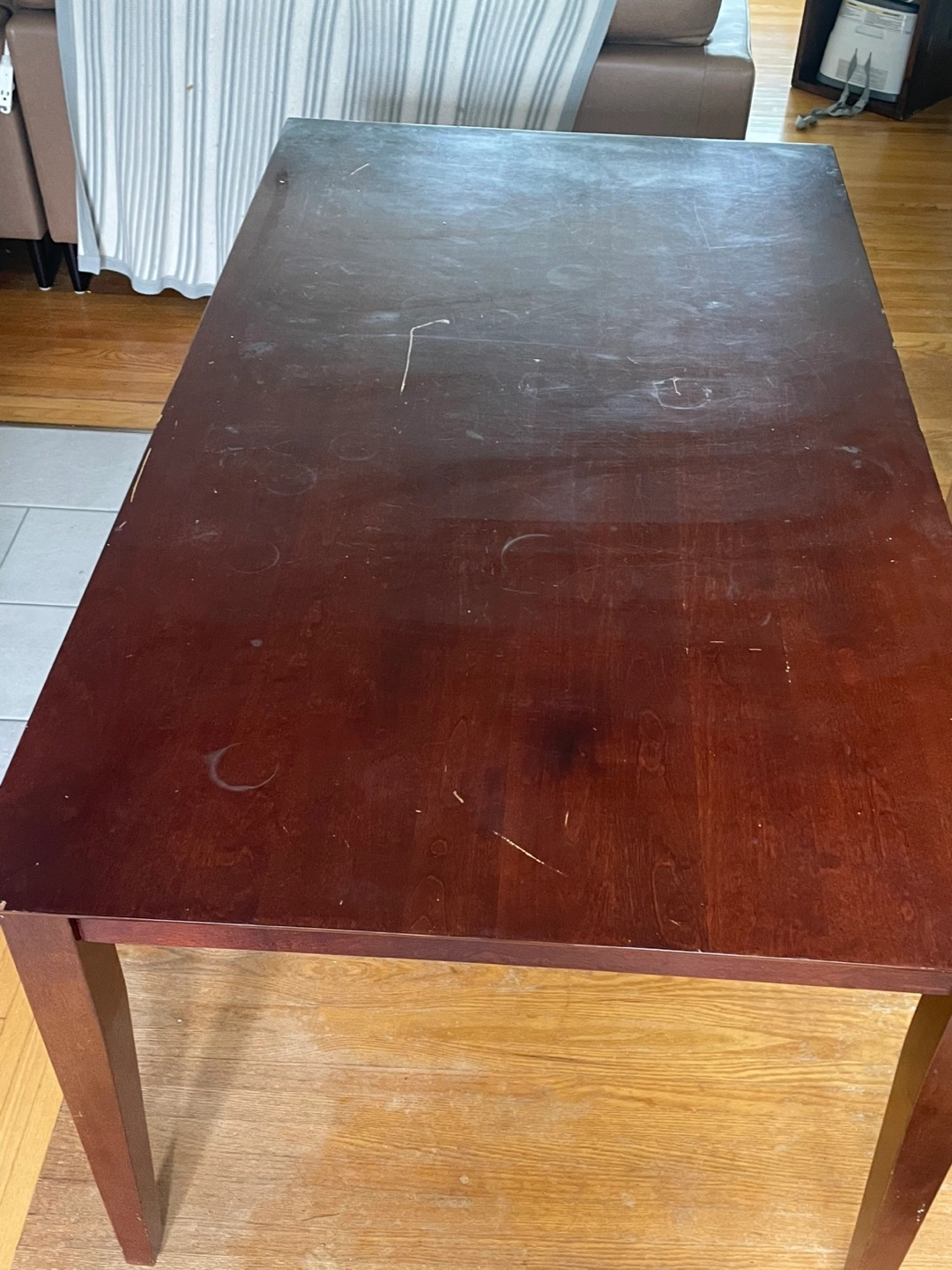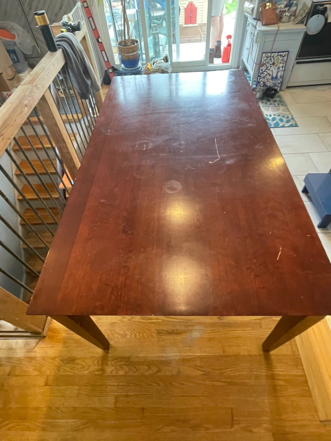 Dining Room Hardwood Table LARGE Heavy duty table Not rickety whatsoever. A little bit of marks on the surface. Moving sale! 68” x 38” x 30” Listed for $200 Reduced to $80 cash Pick up is in east kildonan on Dunrobin Ave Pick up will require a large SUV or a truck. We have the table disassembled, and it only take an Allen key to put the table legs on. It’s heavy, so maybe bring a friend to help you lift it, if not someone here can likely help you. Cash only. No e-transfer. No delivery possible.