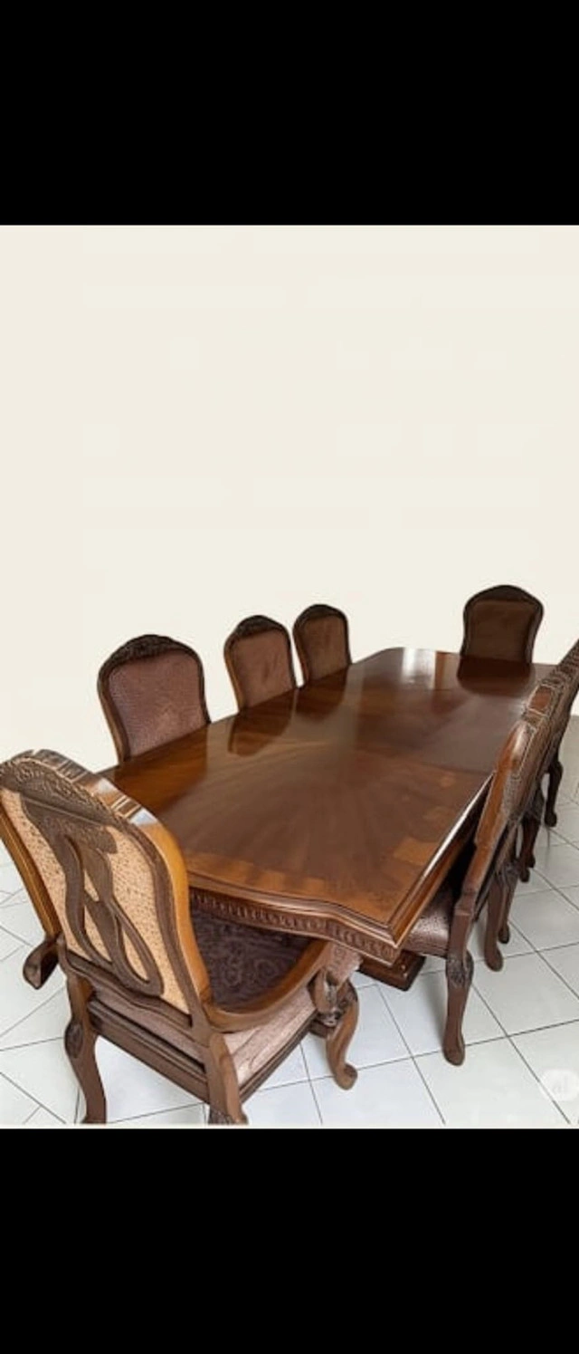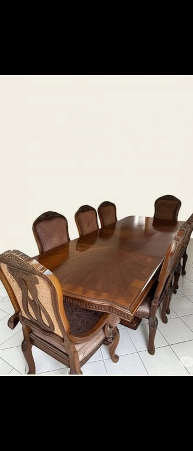 This elegant, used dining set features a beautifully crafted table and six chairs, perfect for family gatherings or dinner parties. The set showcases intricate detailing and a rich, warm finish. There are some signs of wear, which add to its character, but overall it's in good condition and ready to be the centrepiece of your dining room. * Table Dimensions: 72 inches (L) x 42 inches (W) x 30 inches (H) * Chair Material: Upholstered fabric with wooden frame * Seating Capacity: 6 Also some of the chairs bottom fell off but still they function and I need gone