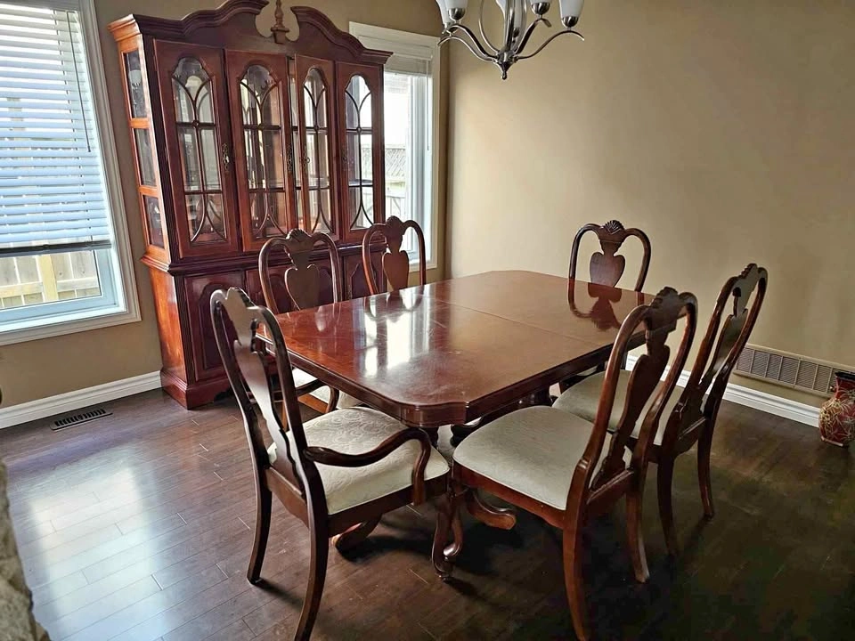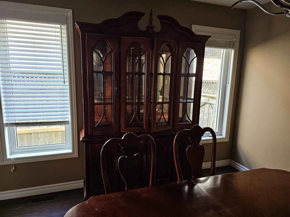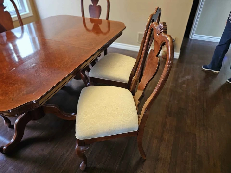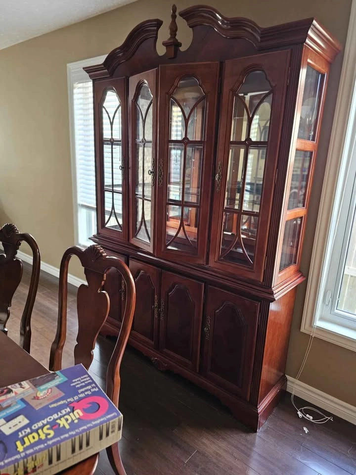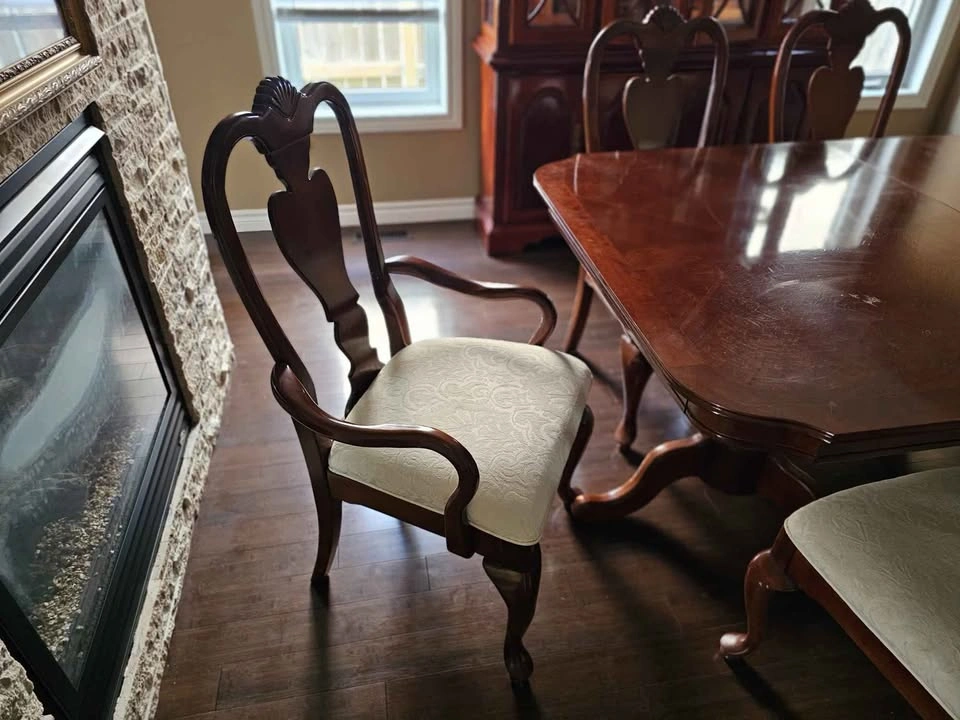 10Beautiful Dining Room includes: Table and set of six chairs with light beige cushioned seats. There are 2 armchairs and 4 side chairs. The table has a cherry dark wood color with carved legs and slightly round edge. Also selling a matching hatch (China cabinet) with glass doors for displaying fine dinnerware and 4 cabinet doors at the bottom for storage. Table, chairs and hutch are in good condition. Pet and smoke free home.