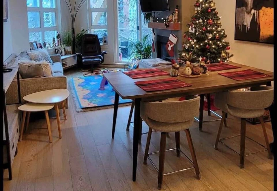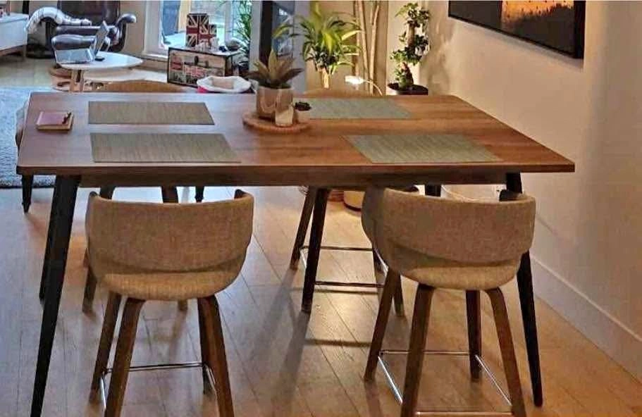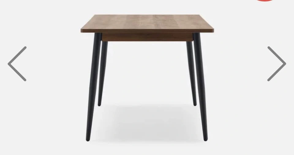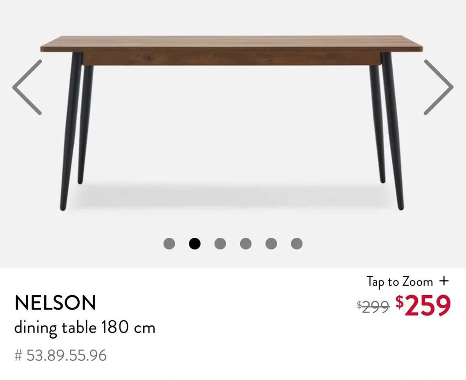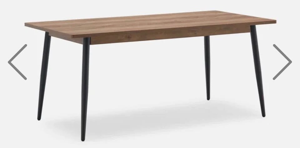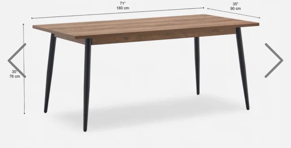 Tabletop: 3D printed imitation oak veneer atop engineered wood. Legs: iron. Seats up to 8 people (with 51 cm [20"] wide chairs). Please note that the table legs’ position may affect some diners’ comfort. Maximum seating is suggested without regard to the table legs’ position. PRODUCT DIMENSIONS Width: 180 cm (71") Height: 76 cm (30") Depth: 90 cm (35") Some scratches on the surface.