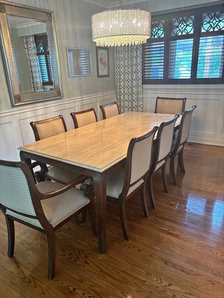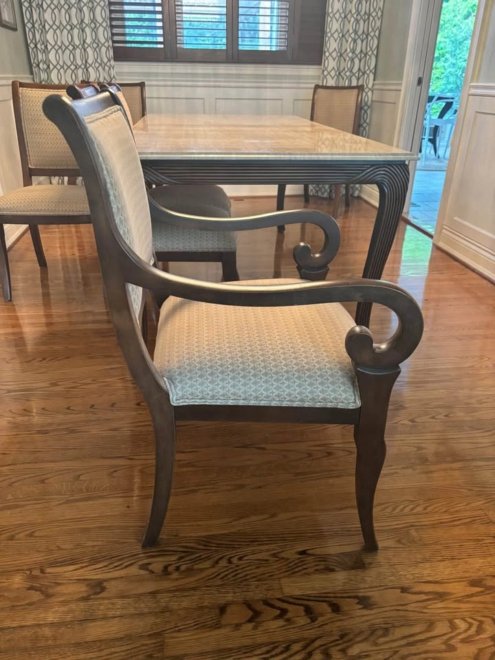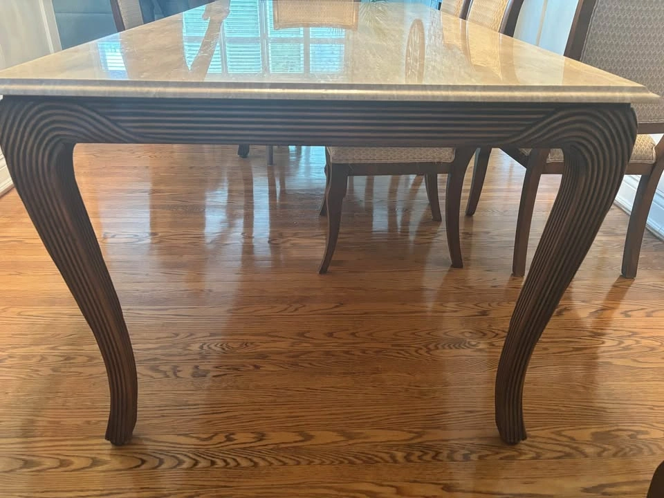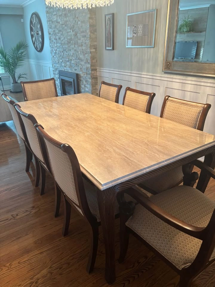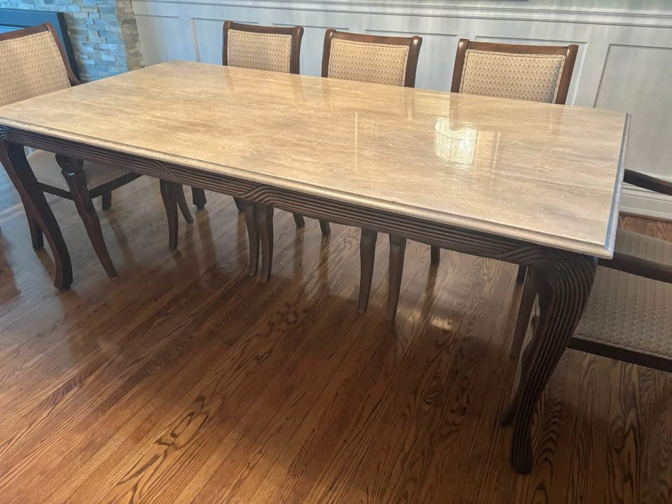 10Sold as a set for $1500. May be sold separately: Chairs $1200. Table $800. Solid wood table base and chair frames - walnut colour. Solid travertine table top. Custom Upholstered chair seats and back - Fabric in excellent condition. Chairs include 6 side chairs and 2 arm chairs. Table top dimensions are 38” by 78”. Table base could be used with a different stone or wood top. Note: Stone table top is very heavy and will require at least 3-4 people and truck to move. Pick up only - Buyer responsible to move from current location. Home is non smoking and pet free.
