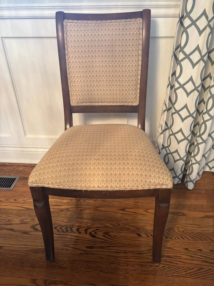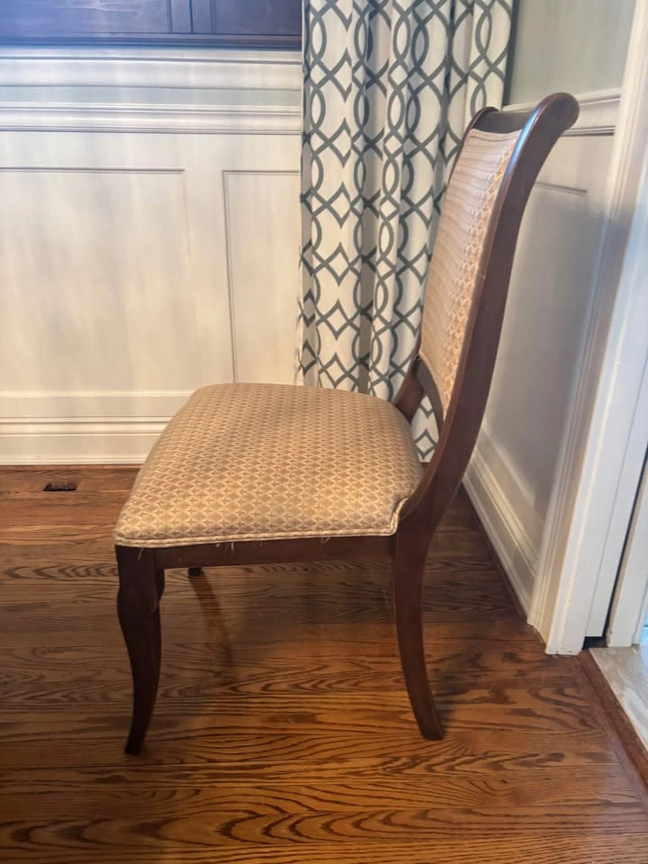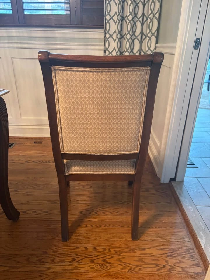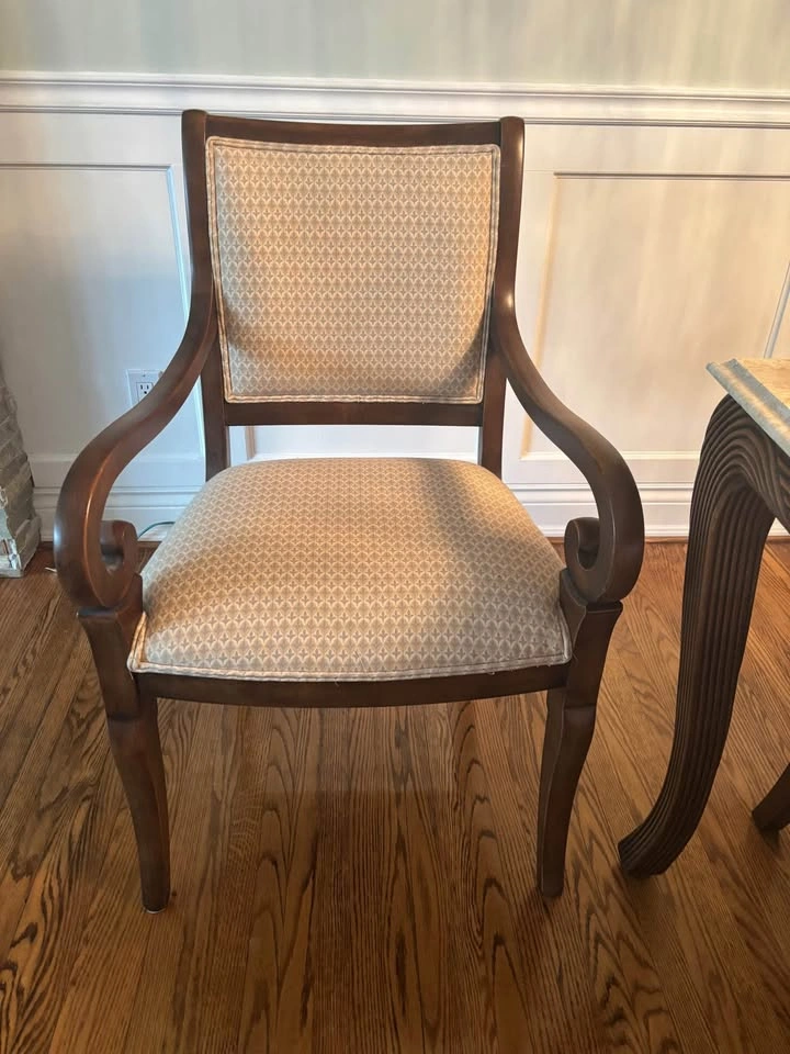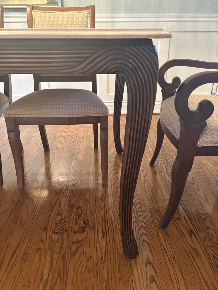 10Sold as a set for $1500. May be sold separately: Chairs $1200. Table $800. Solid wood table base and chair frames - walnut colour. Solid travertine table top. Custom Upholstered chair seats and back - Fabric in excellent condition. Chairs include 6 side chairs and 2 arm chairs. Table top dimensions are 38” by 78”. Table base could be used with a different stone or wood top. Note: Stone table top is very heavy and will require at least 3-4 people and truck to move. Pick up only - Buyer responsible to move from current location. Home is non smoking and pet free.