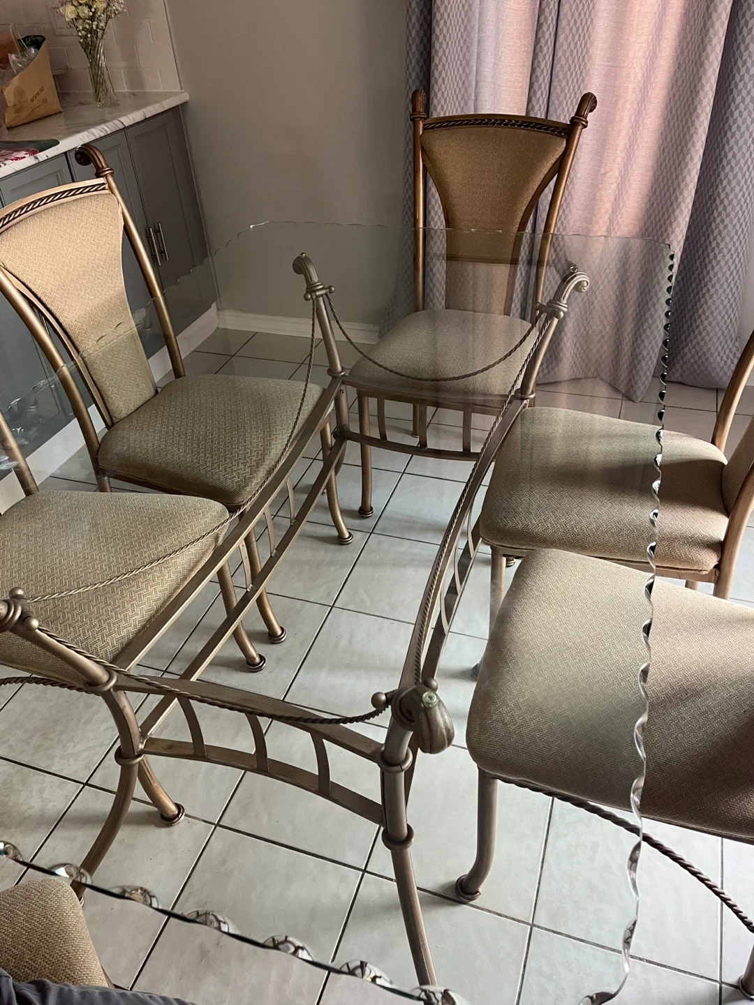 23Selling a set glass very strong table and 6 chairs. They are in great condition and would be a great addition to any kitchen or dinning room! Pick up will require a couple strong people as table and chairs are heavy. Length 66” Width 44”