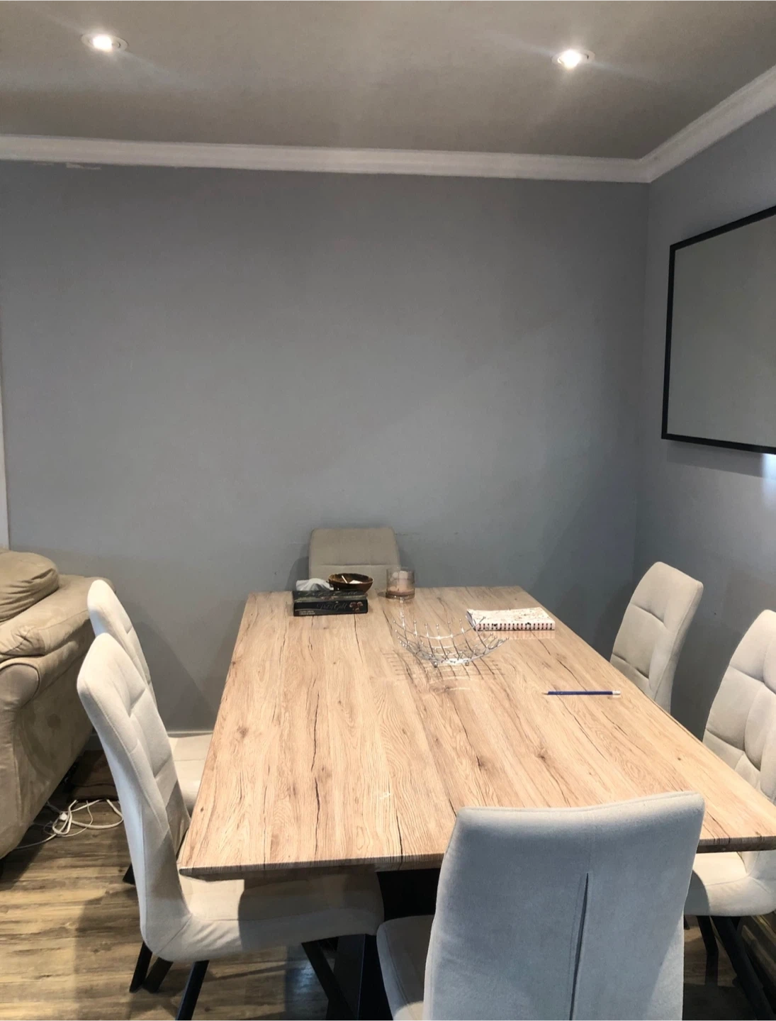 83Large 6 person dining table and 6 beige fabric chairs. Purchased as a set from Lord Selkirk Furniture. Solid metal base with a large neutral top faux-wood vinyl top. We covered it in a clear plastic table cover (seen in the photos) so it is in like-new condition. The cover may have some wear and tear, but the table is fine. Dismantled and ready for pick up. I can take more pictures, but it has already been taken apart.
