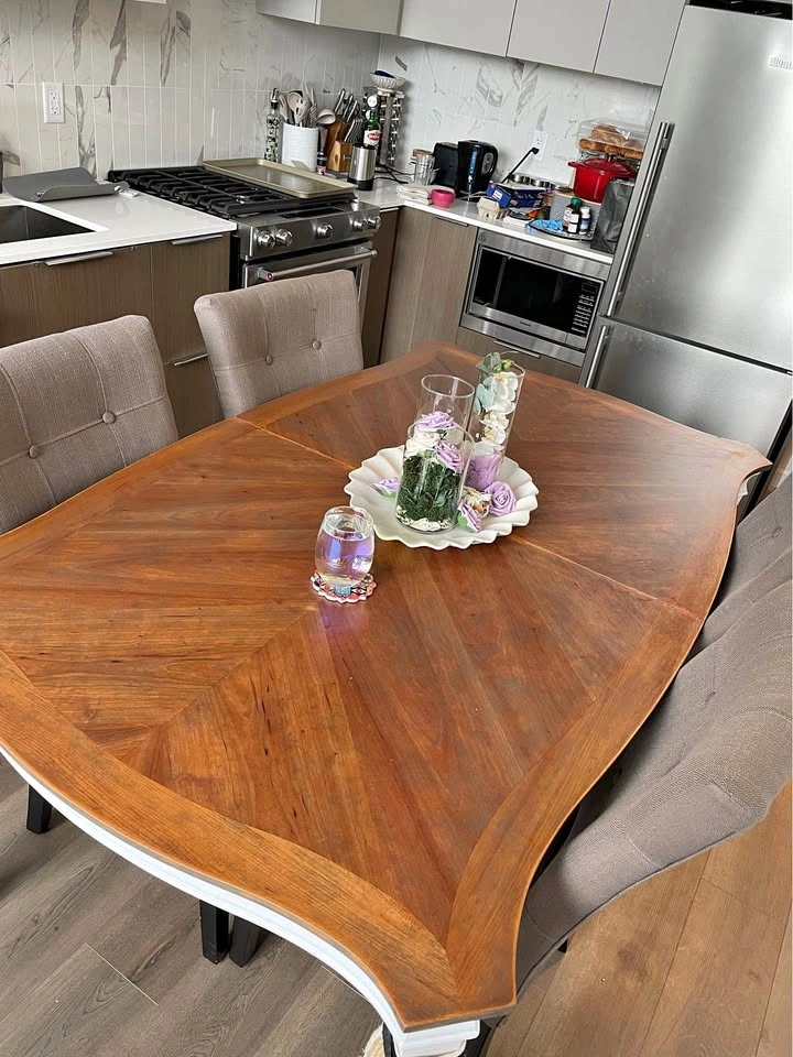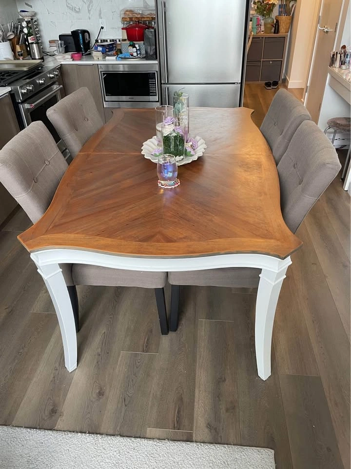 Sturdy wooden dining table fits 6 people comfortably. Table will be given with the varnish we have in case you want to give it a fresh coat on the top. 4 almost new chairs (bought 6 months ago at $75/chair. Selling the four chairs for $170 Selling the table for $100 If you buy the chairs and the table, price is $250 Only selling because we are moving and can’t fit it in. Pick up only. The table legs can be taken off for easier transport. You need a truck to pick up. Pick up close to Burquitlam station