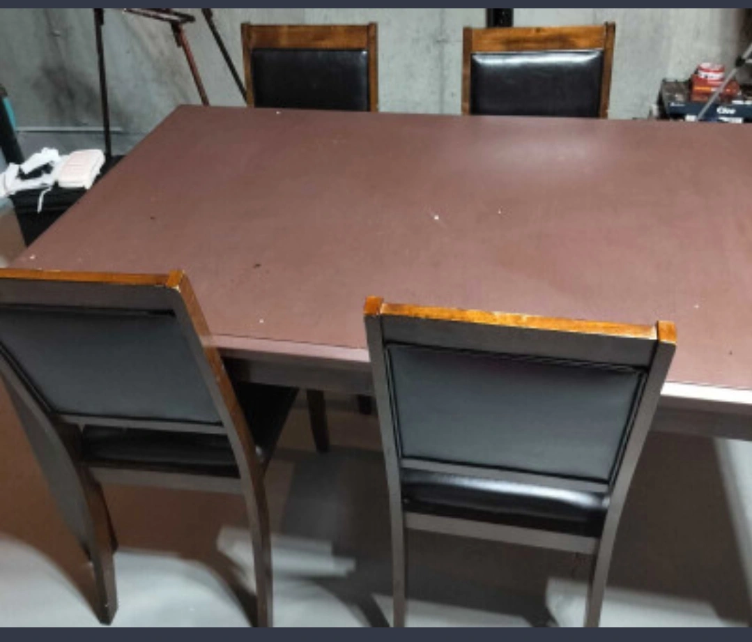 Selling a dining table with four chairs. The table appears to be a brown colour, and the chairs have a dark wood frame with black leather seats. It's a great set for a family or anyone who enjoys hosting dinners! The set shows some signs of use but is still in good condition for its age