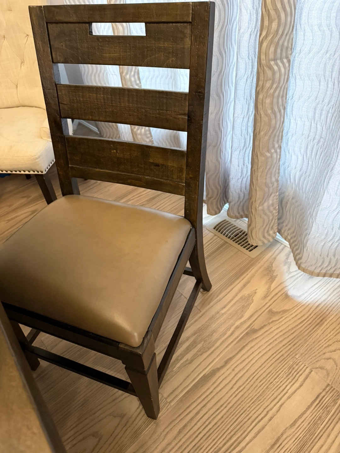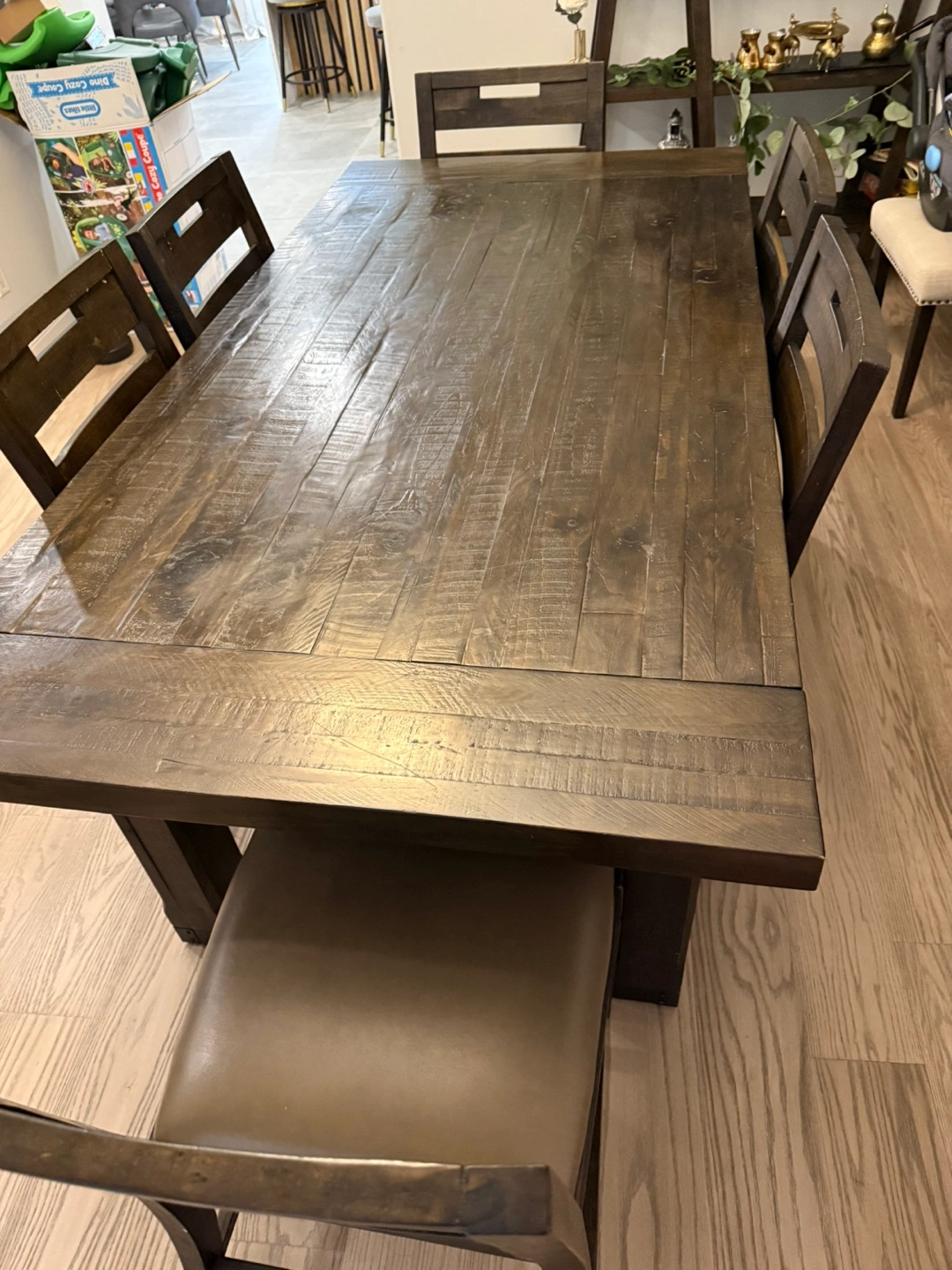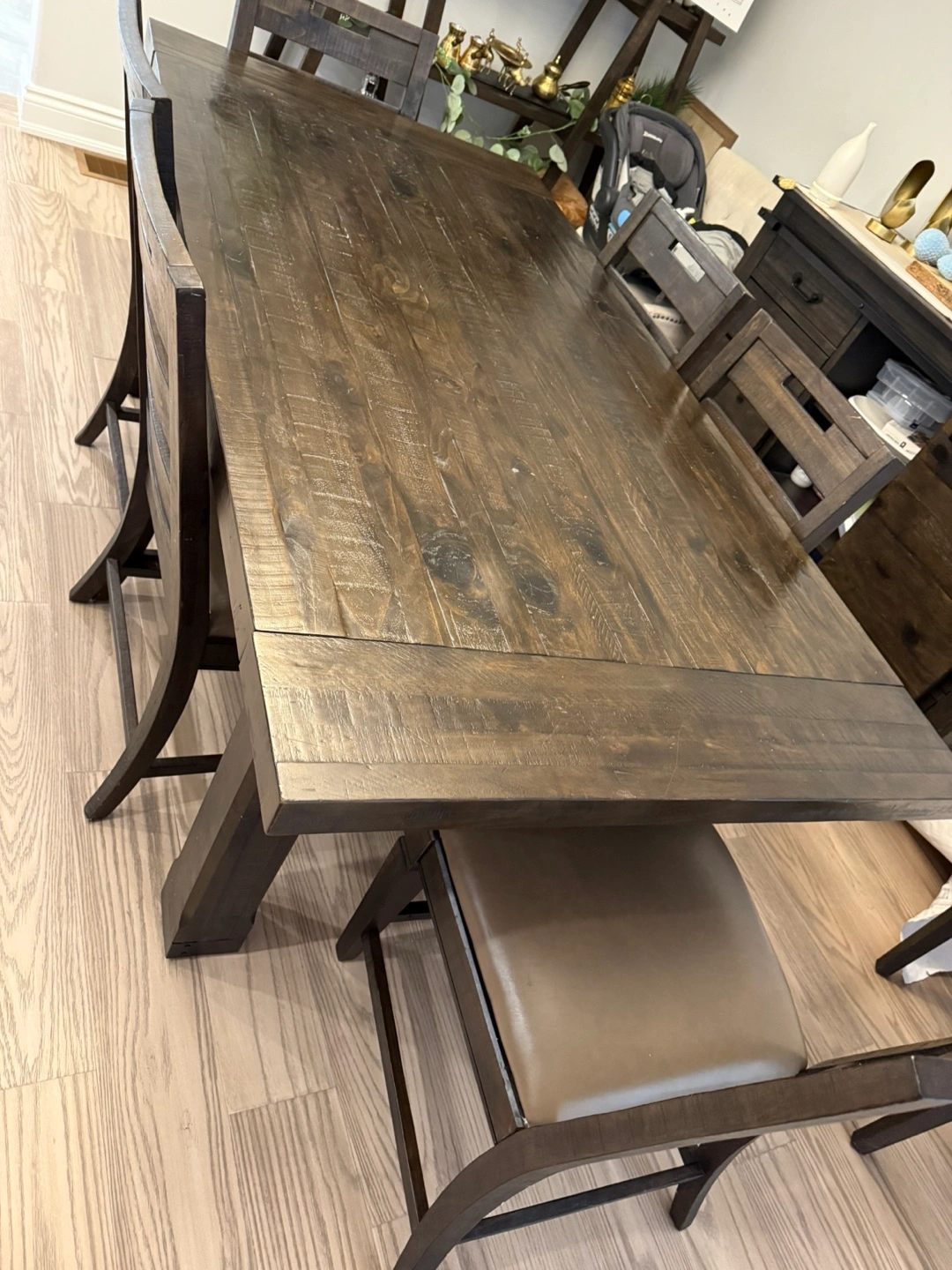 5Dining table with 6 chairs and 2 cream fabric = 8 total. Table has a dark brown finish with a wood grain look. Chairs are brown with a cushioned seat. The chairs have a slatted back. With buffet server (sliding door and 6 drawers) standing height. Comes with 2 extensions for table : 111.5 inches total with extension. 80 inches without. Paid over$5000 for this .