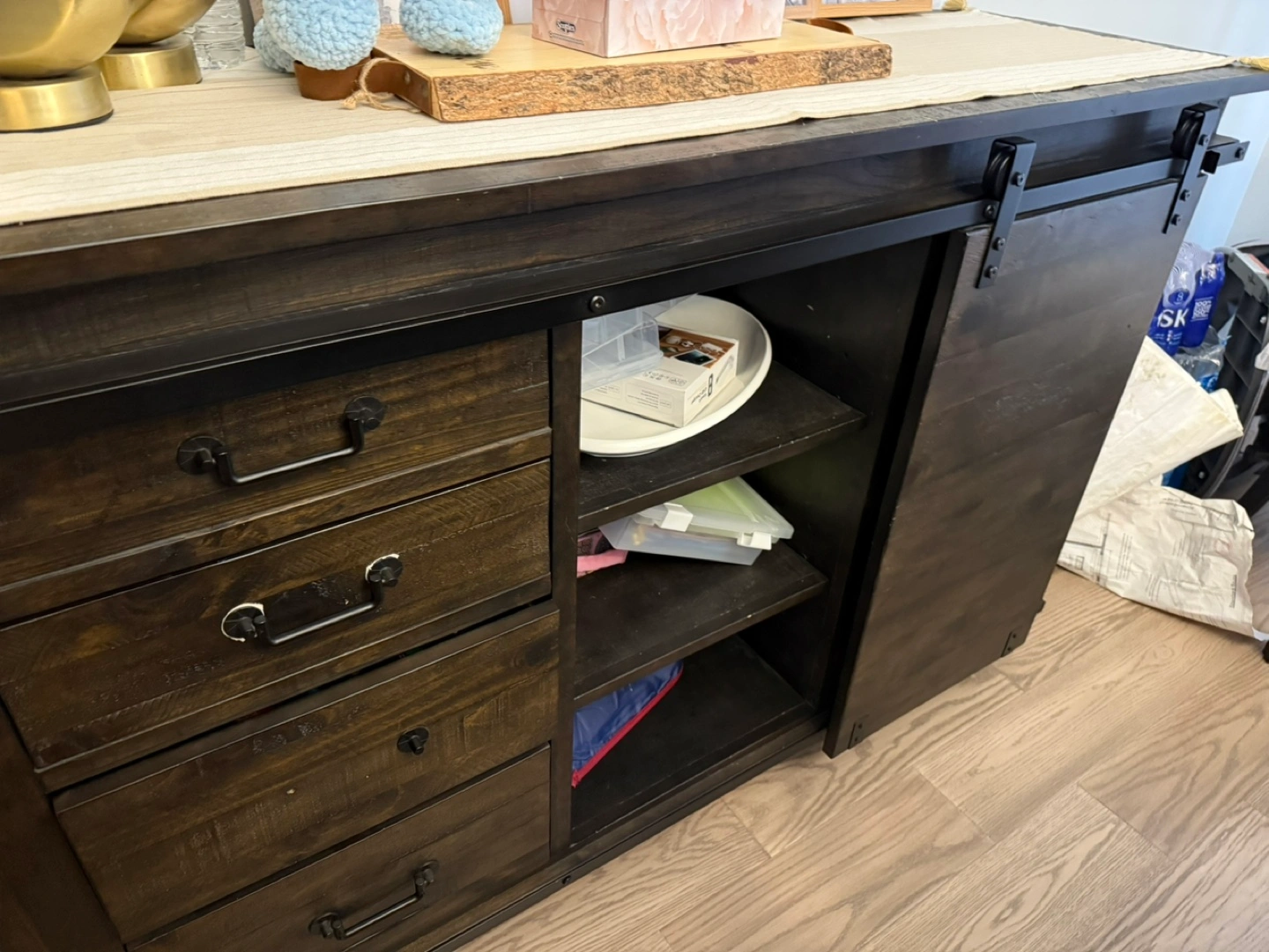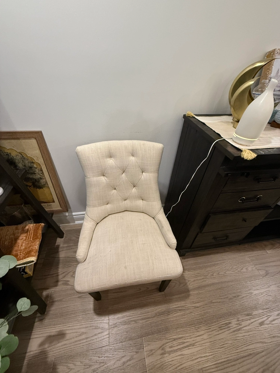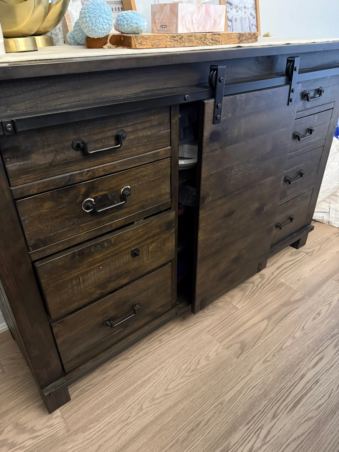 5Dining table with 6 chairs and 2 cream fabric = 8 total. Table has a dark brown finish with a wood grain look. Chairs are brown with a cushioned seat. The chairs have a slatted back. With buffet server (sliding door and 6 drawers) standing height. Comes with 2 extensions for table : 111.5 inches total with extension. 80 inches without. Paid over$5000 for this .
