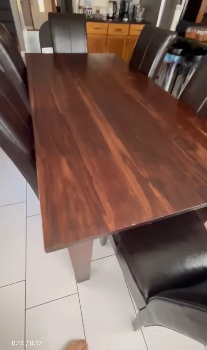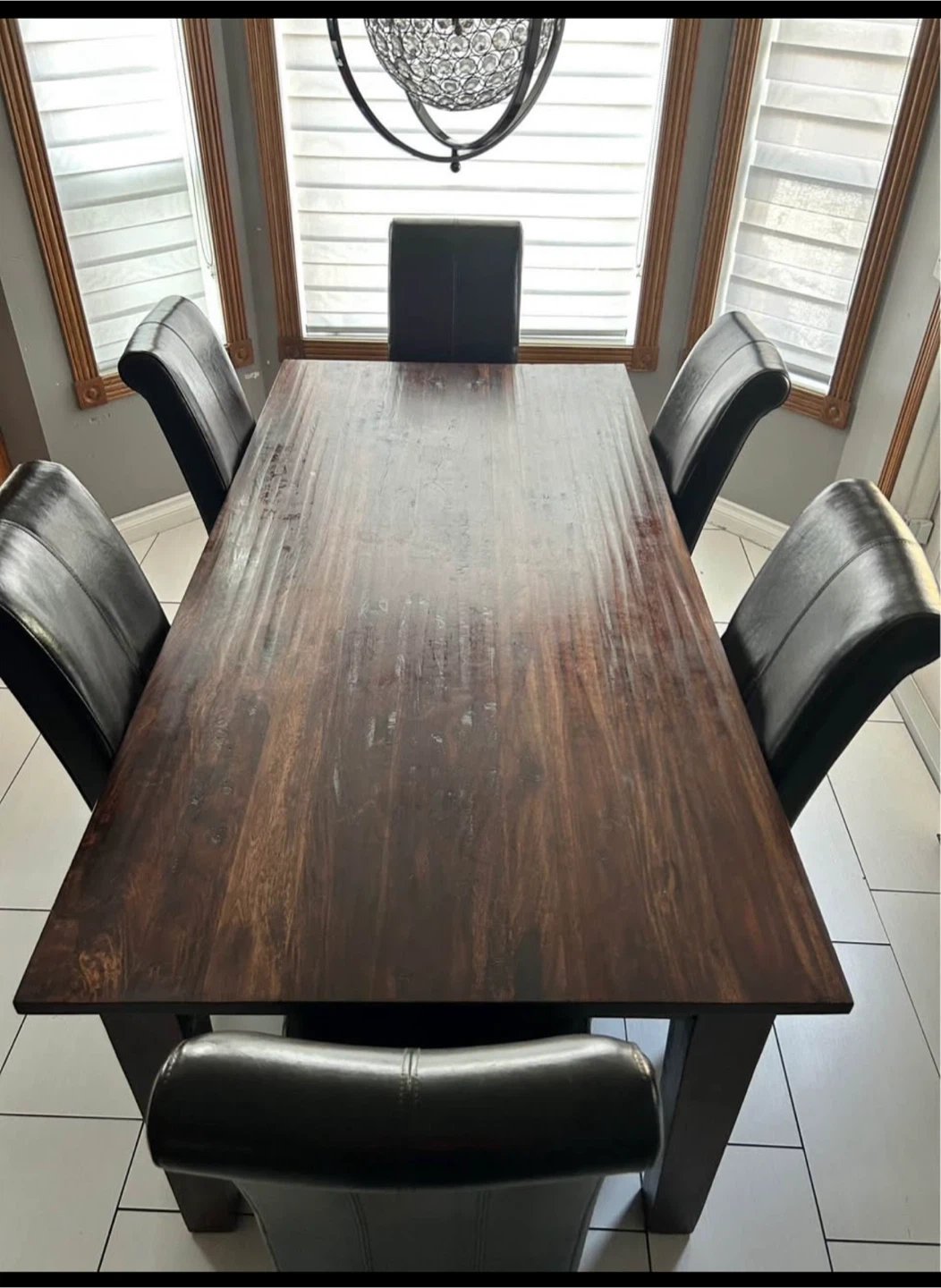 15Hard wood beautifully crafted table in great condion. Paid 1200. Asking 650.00. The chairs are free with the table. There are some cracks on the seats. But can be reupholstered. Price is based on table only not table with chairs.