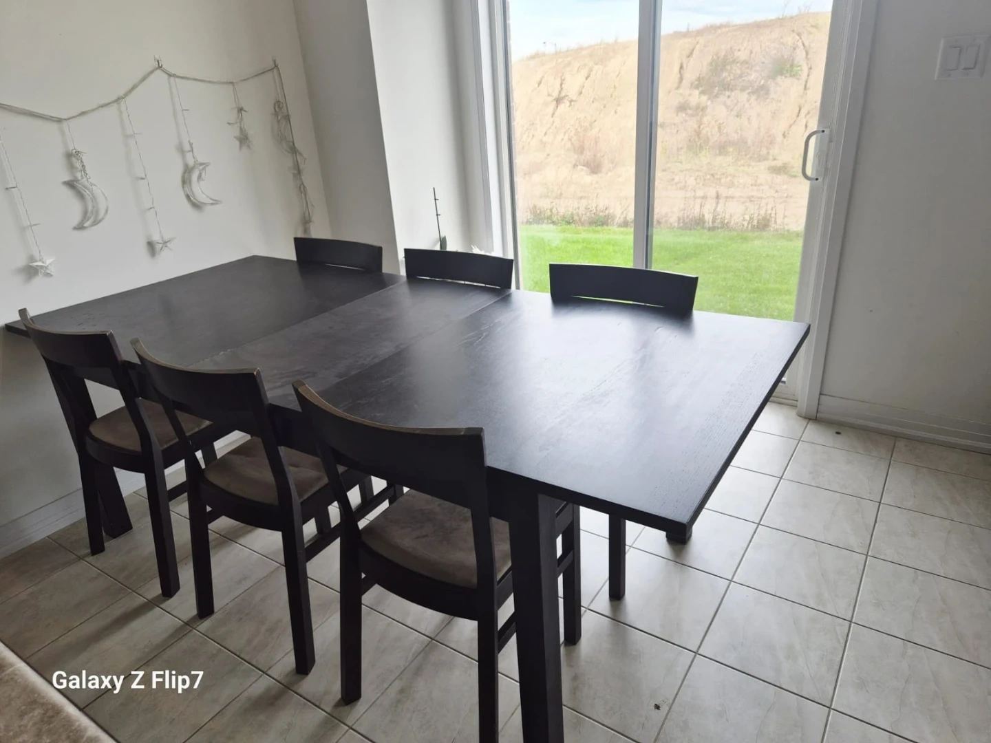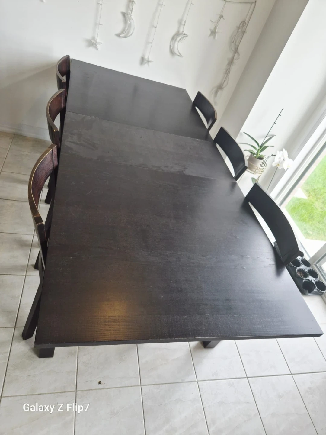 60Selling a dining table with 8 chairs. The set is a dark wood colour and would look great in any dining room. It can convert into a 4, 6 or 8 seater. It has 6 identical chairs with 2 master chairs. It's in good condition and ready for a new home!