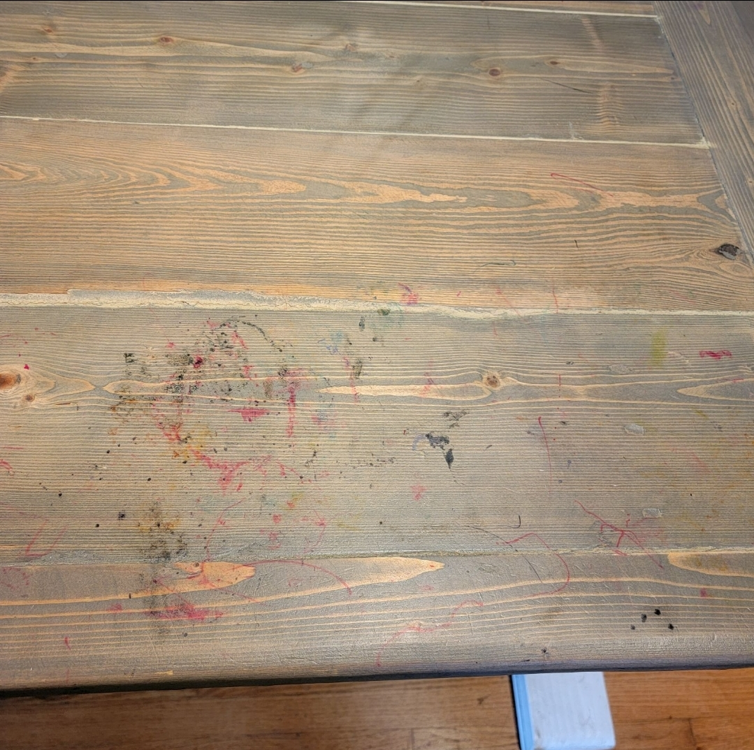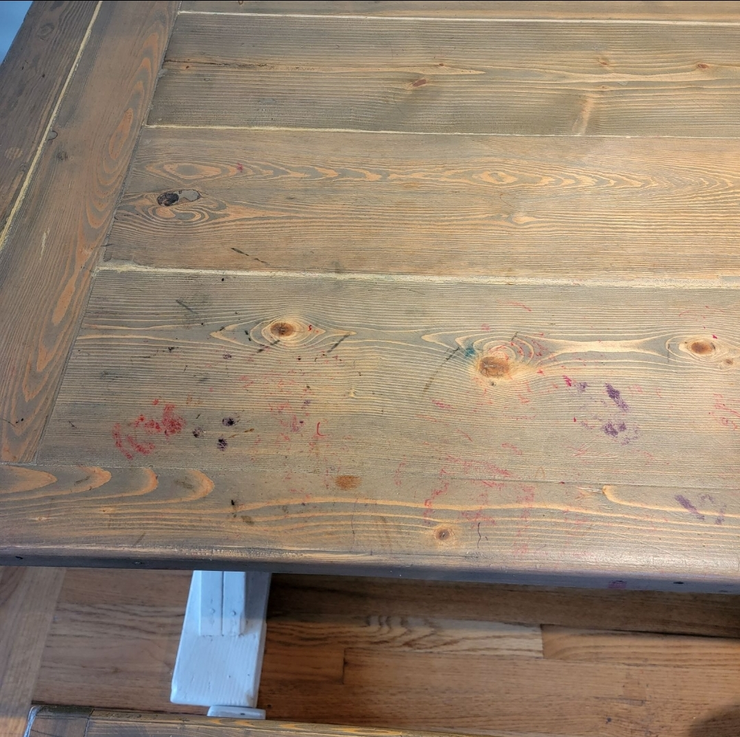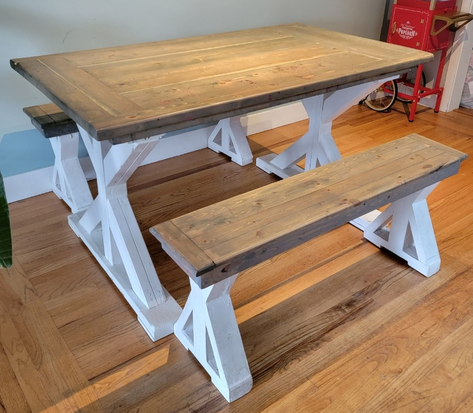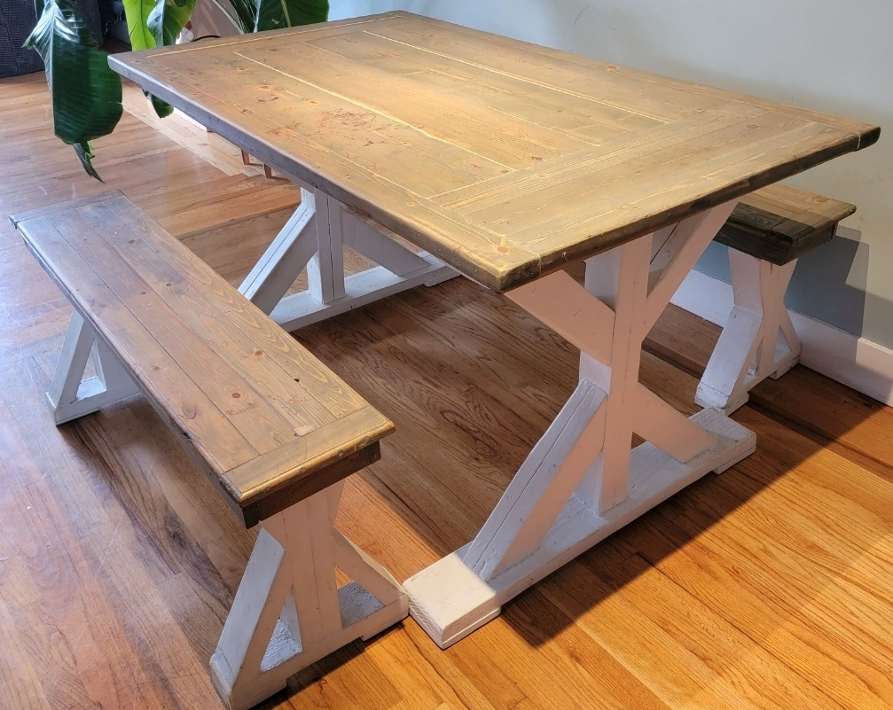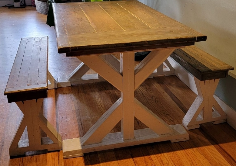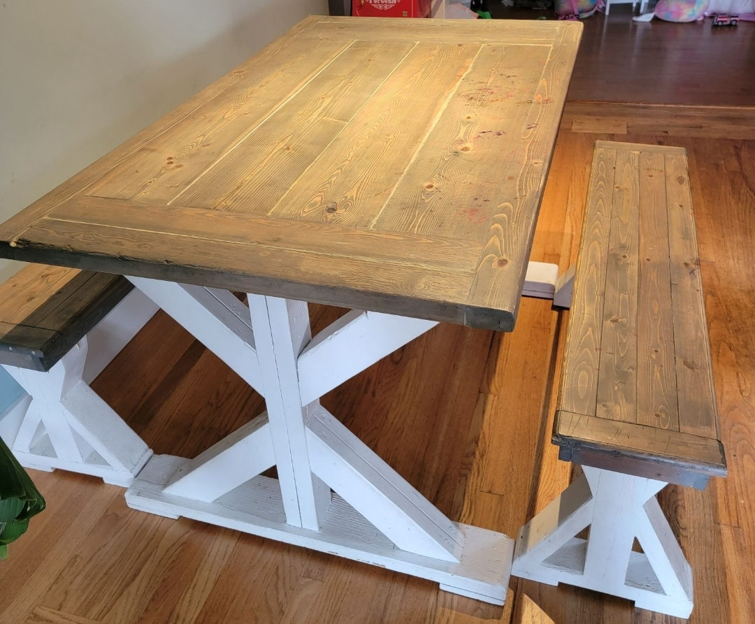15Custom Farmhouse style wood table and two benches, paid over $700. Table needs a bit of work. Table is solid and very heavy. Table Measurements Length - 4 ft 11inches Width - 2 ft 10 inches Height - 2 ft 8 inches Bench Measurements Length - 49.5 inches Width - 10.25 inches Height - 20.25 inches PU South Surrey/Ocean Park area - message if interested! Condition: Table is solid and overall good condition. *See Photos* - needs top sanded,restained/painted and treated with water resistant coat. This is due to markers on table from Kids listening when saying " don't color on table". - New lag bolt is needed underneath in picture shown as the right leg partially broken in move. -Benches do have light squeak to them if you rock side to side on them. If demonstration is needed one of our kids is a professional at it. But also it was do to the way they were constructed. Smoke and pet free home.