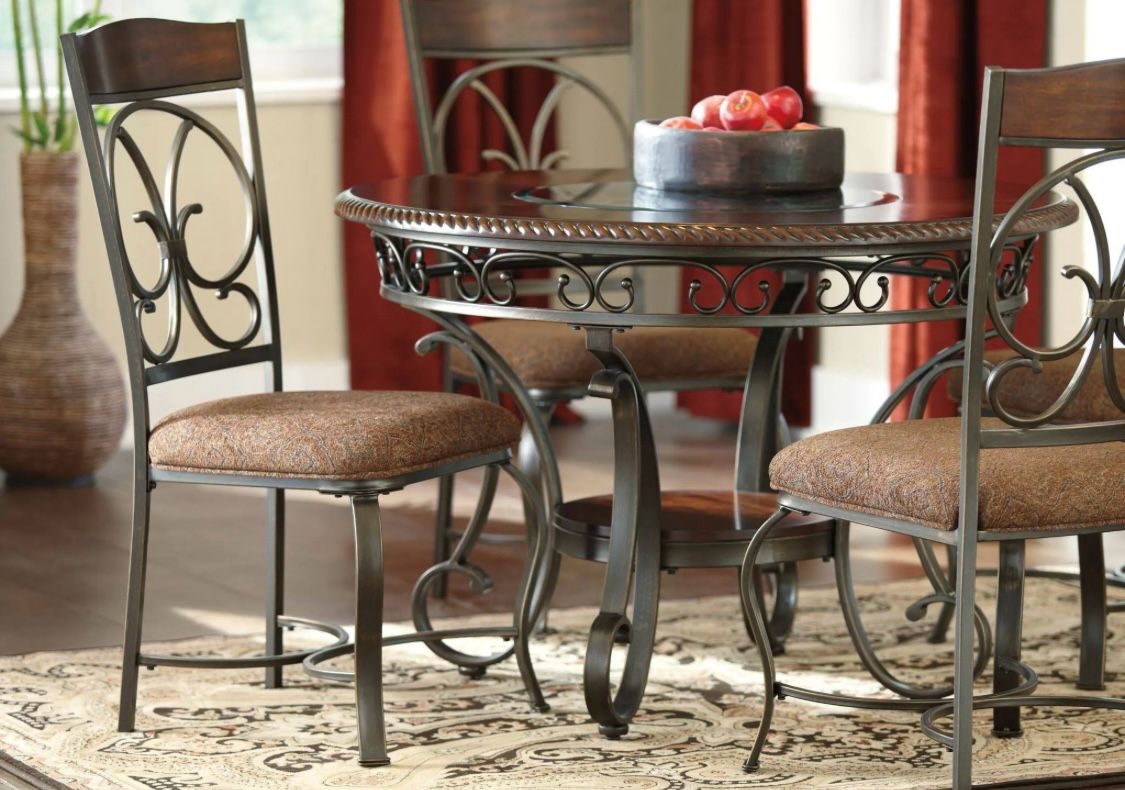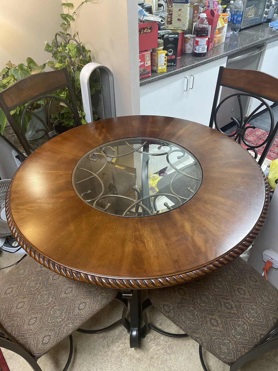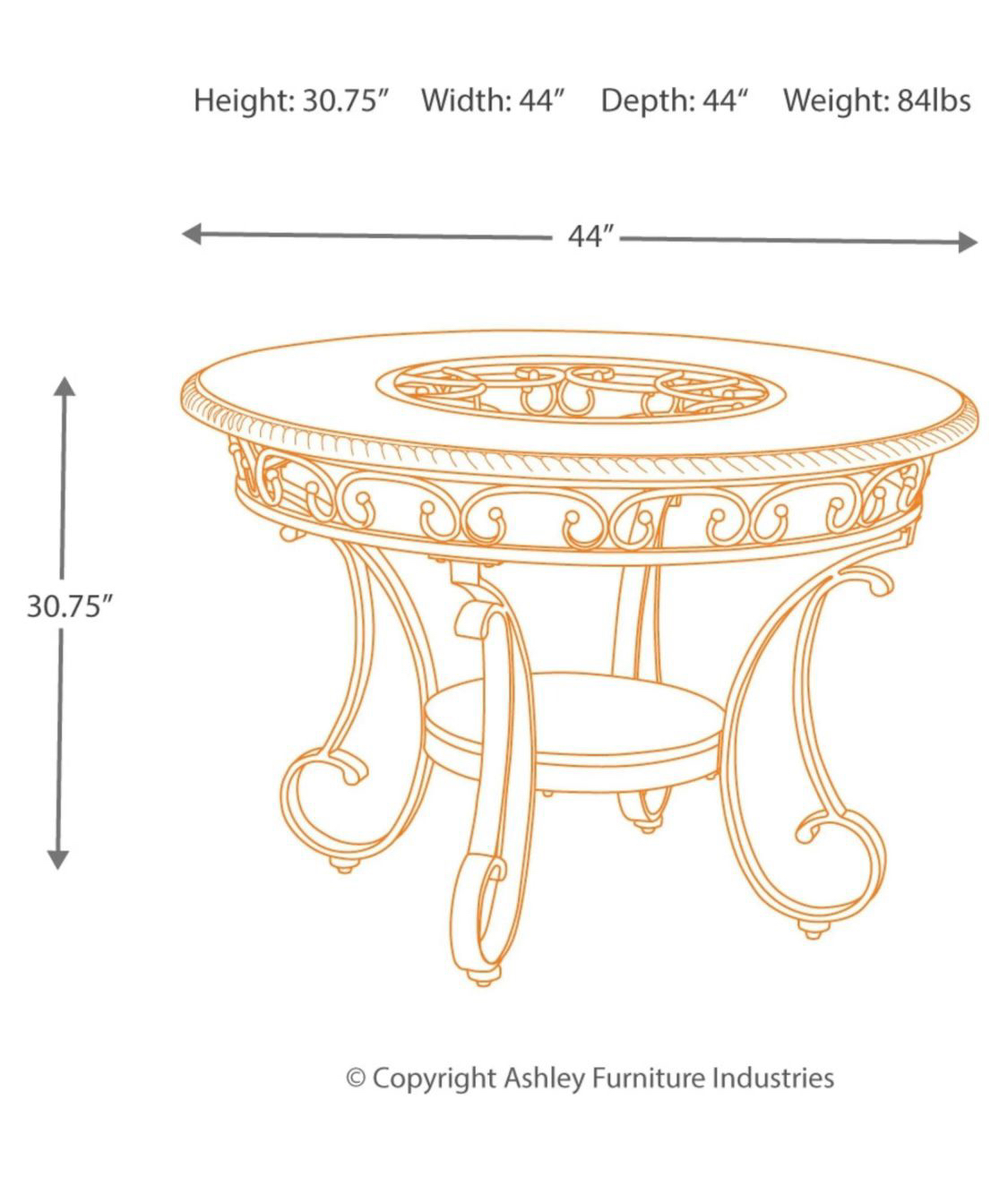 A 4 seat 44” round dining table from Ashley. It’s only a couple years old, I’m only selling it becausey it’s too small for my family. Materials are wood and metal. It has a couple minor scratches and rings which can be easily fixed with some products. Comes with the table and all 4 chairs. It’s a great sturdy table. Pickup only. Serious buyers only !! Note: the first couple pictures are from online for reference only.