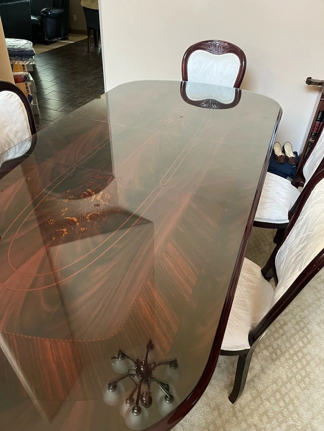 18This elegant, used dining set features a table with a custom glass top and intricate wood detailing, accompanied by six chairs with upholstered seats. The set is in good condition. This dining set would be a charming addition to any home. It's perfect for family dinners or hosting guests! If this ad is still up, it's still available!