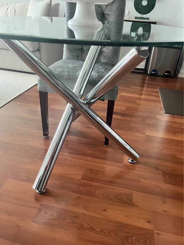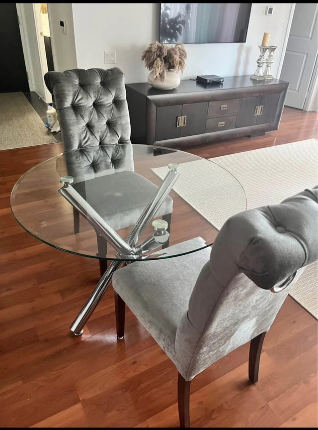 15Selling a dining table and 2 chairs. The glass can easily be removed from the base for easy transport. Signs of wear on the legs of the chair- see pics. Pet and smoke free home! If the ad is up, it's still available!