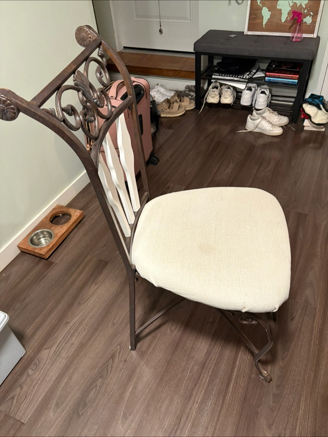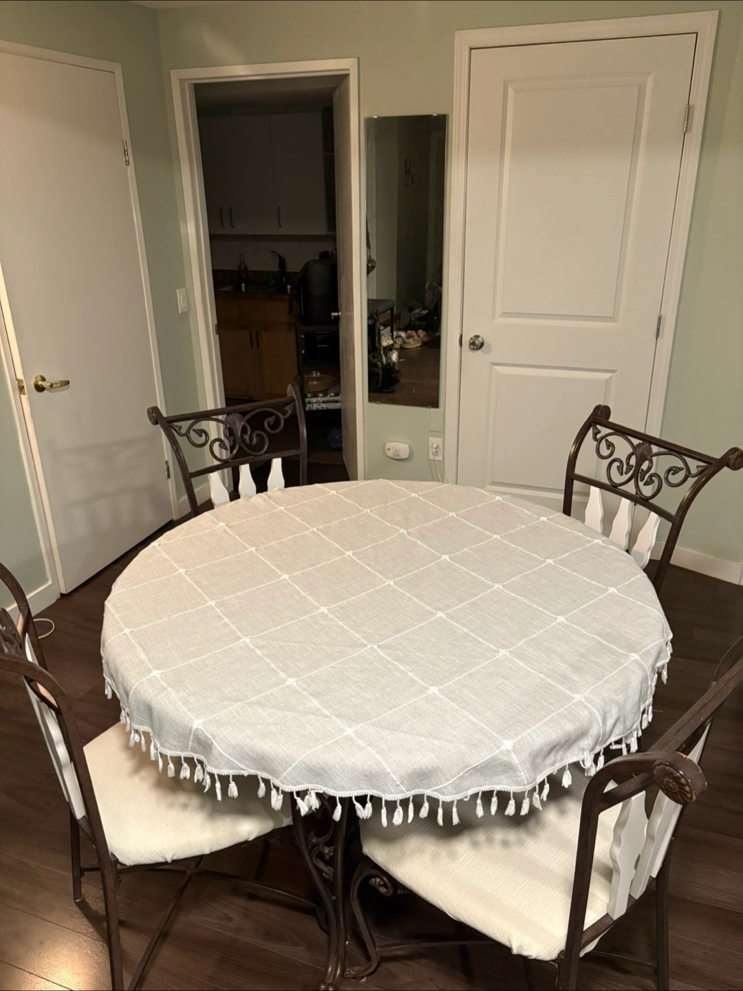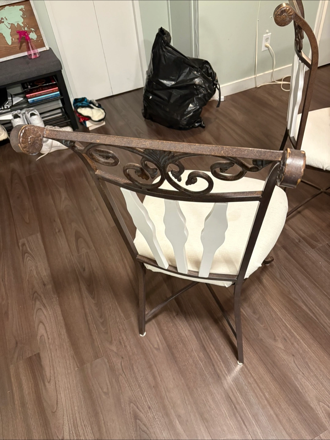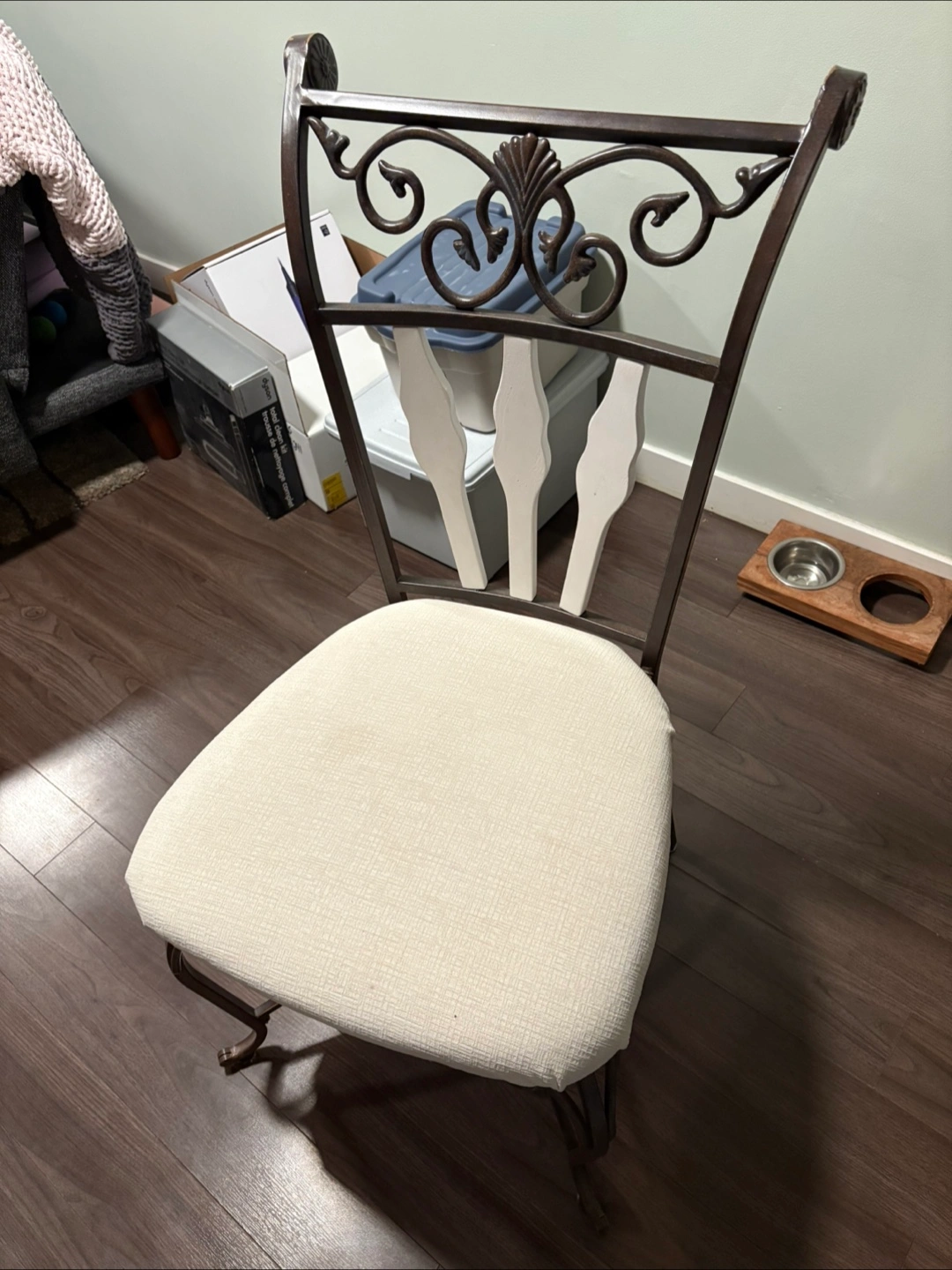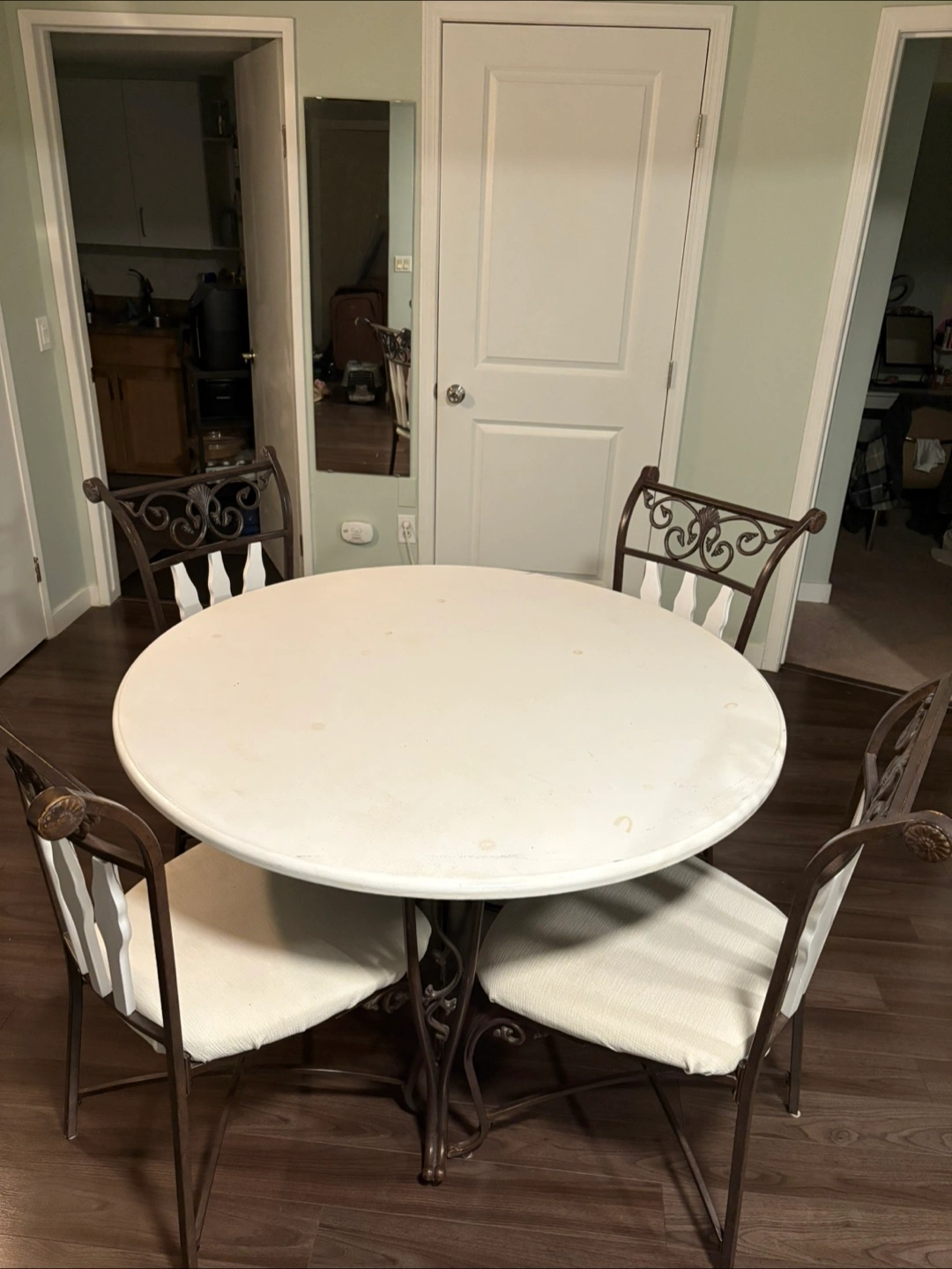 68Selling a round dining table that comes with four chairs. The table has a metal base and a white top. The chairs have a metal frame with a cushioned seat. Perfect for a small dining area or kitchen nook! The table has some wear and tear, but can easily be dressed up with a table cloth or fresh coat of paint.