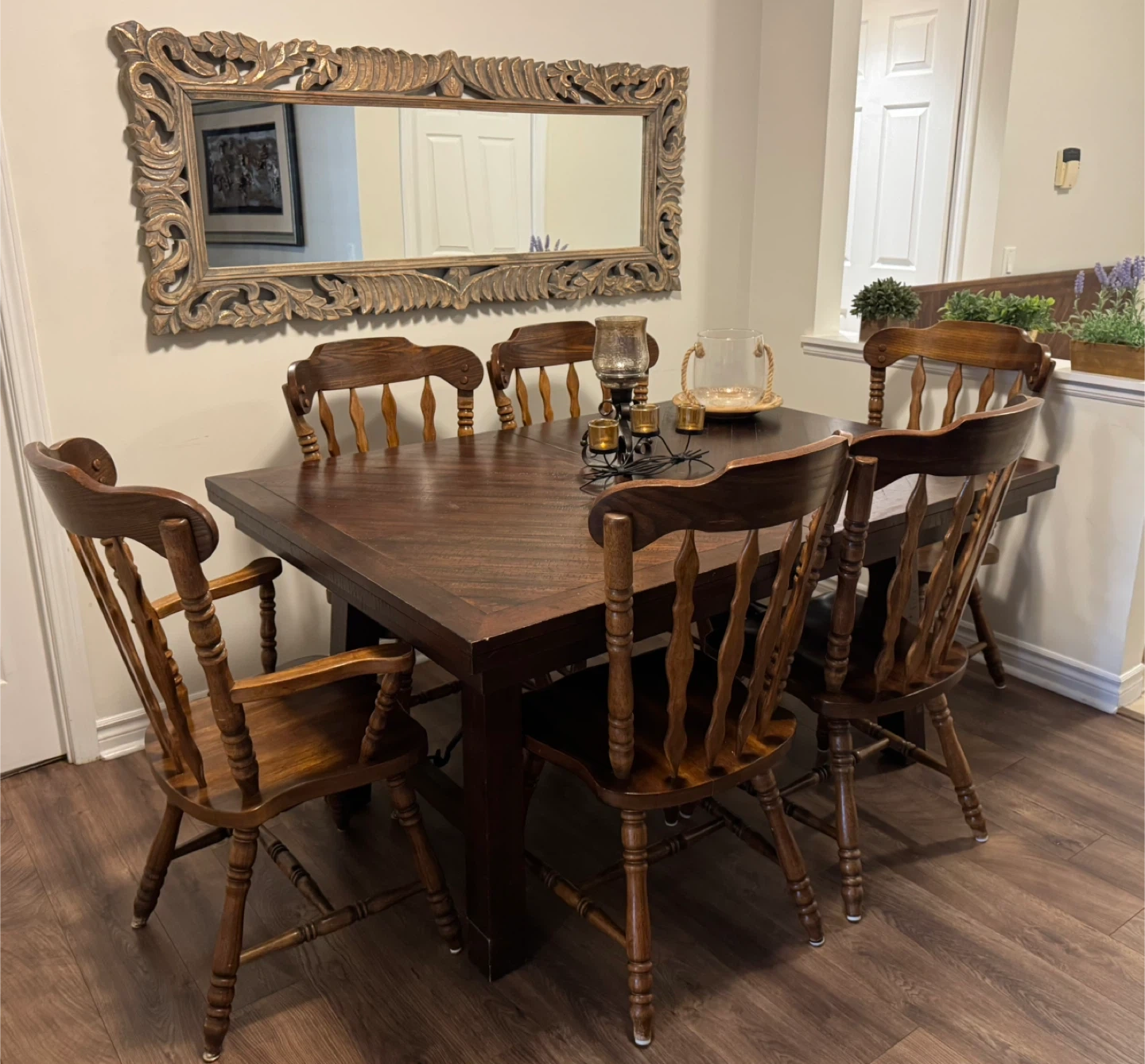 79Selling a dining table set that includes six solid wood chairs. Two of the chairs are captain chairs. The table and chairs have a dark brown finish. Perfect for family dinners or entertaining guests! Table comes with an extension leaf as well. Table dimensions 60 X 42 X 30 inches ( without leaf) Note: The table has two raised areas due to water absorption which can be hidden with decoration pieces or placemats as is shown in the pictures. Only noticeable if looking very closely.