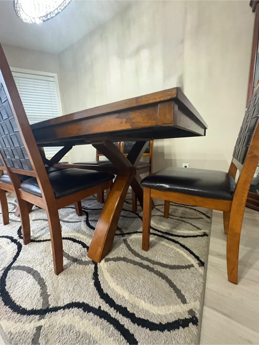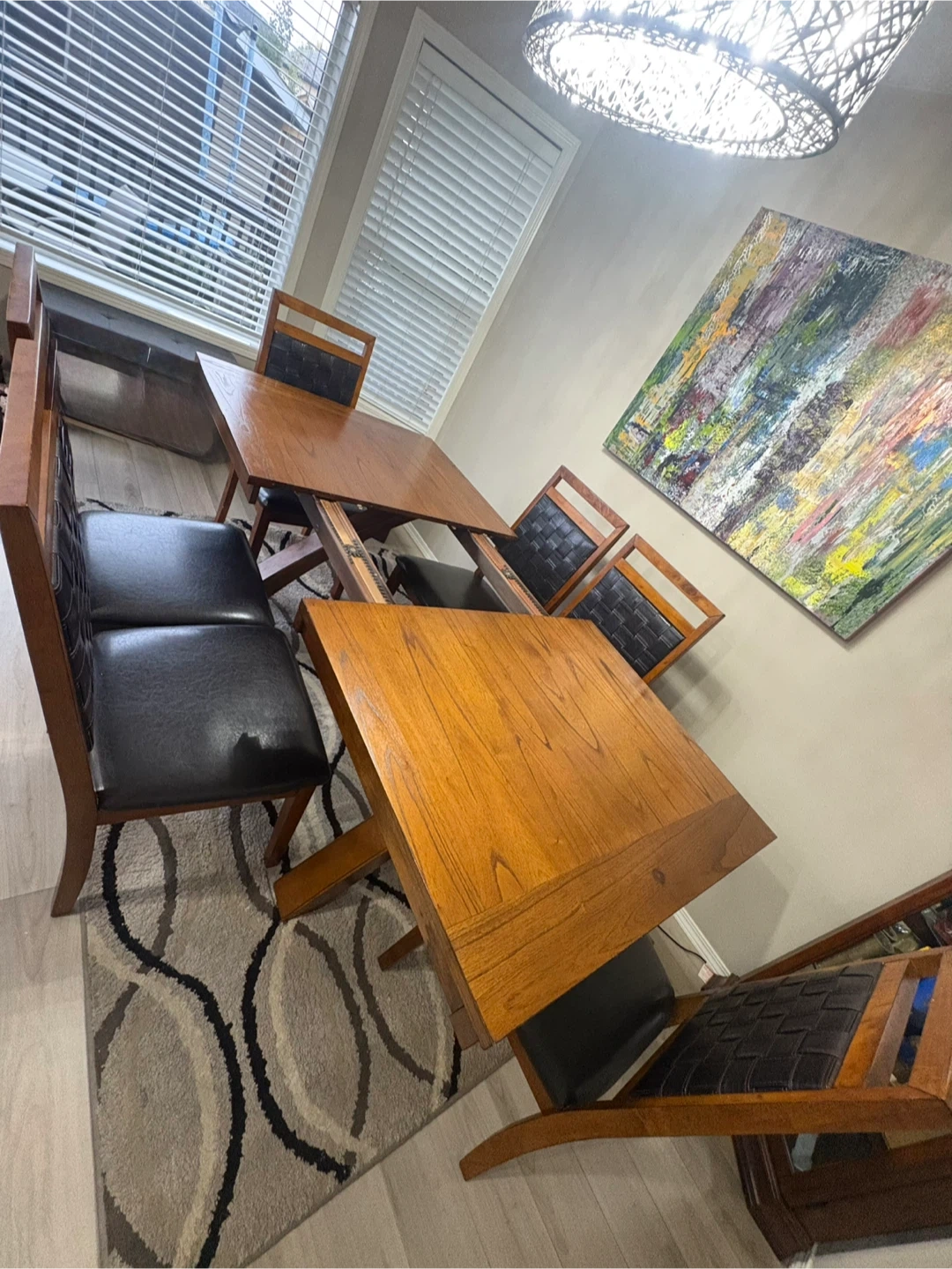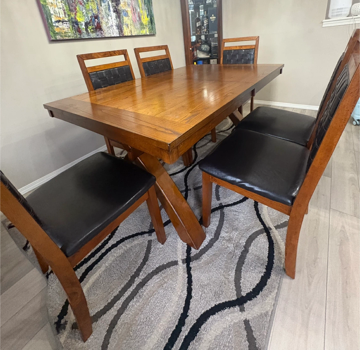 Selling our extendable dining table set that includes 6 chairs. The table has a unique cross-legged design and a wooden finish. The chairs have black leather seats and woven backs. This set would look great in any dining room! Price still negotiable