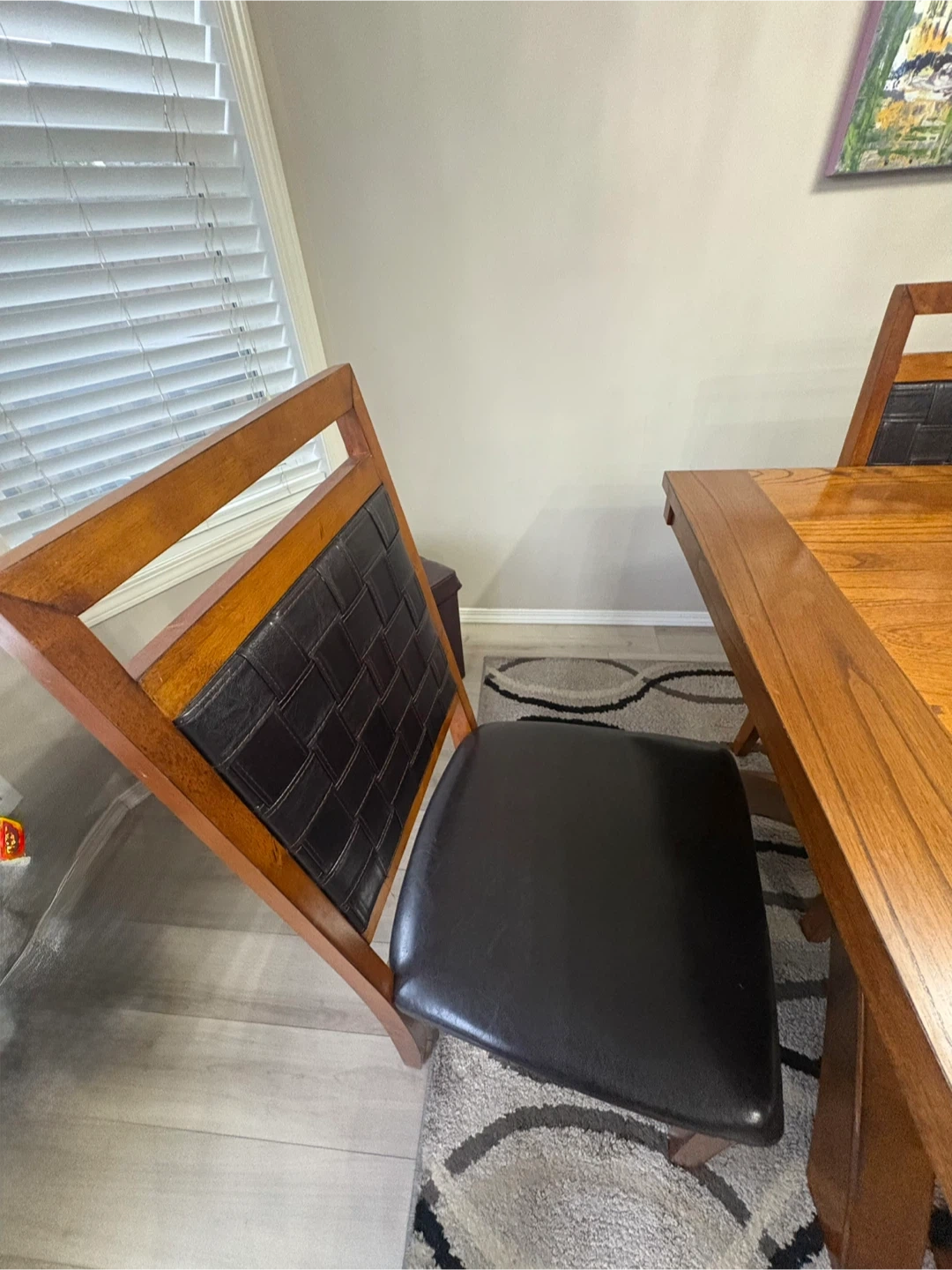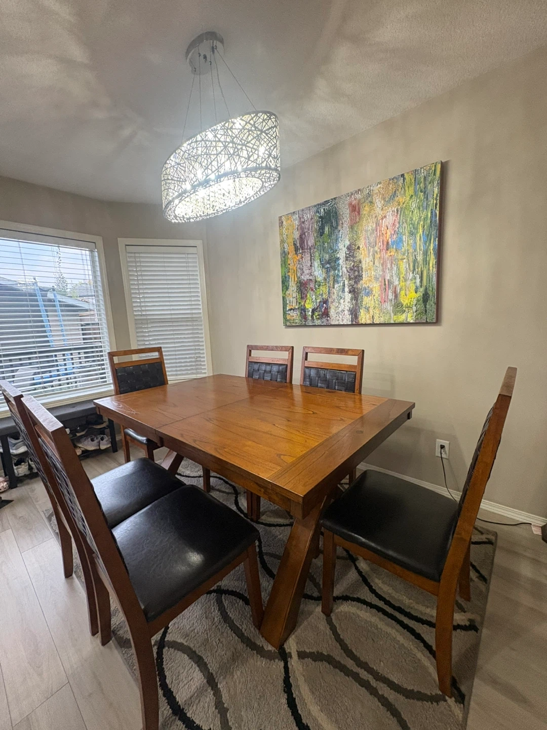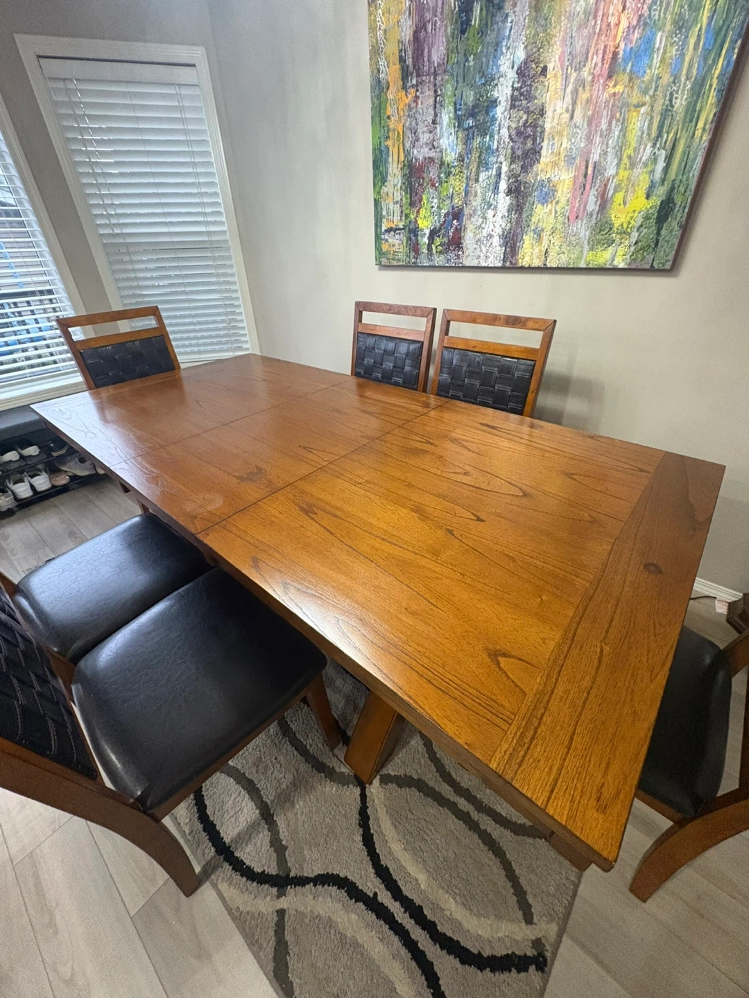 Selling our extendable dining table set that includes 6 chairs. The table has a unique cross-legged design and a wooden finish. The chairs have black leather seats and woven backs. This set would look great in any dining room! Price still negotiable
