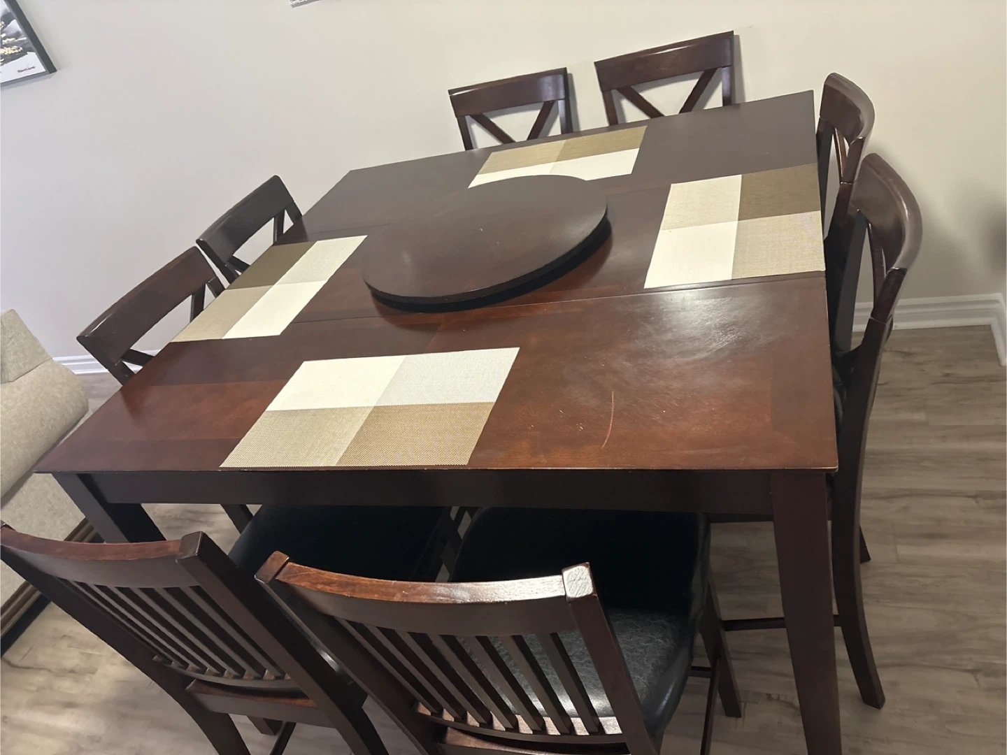 10Selling a dining table set that includes 8 chairs. The table is a dark wood finish with a circular centre piece. The chairs have a matching wood frame and black leather seats. Great for family dinners or gatherings!