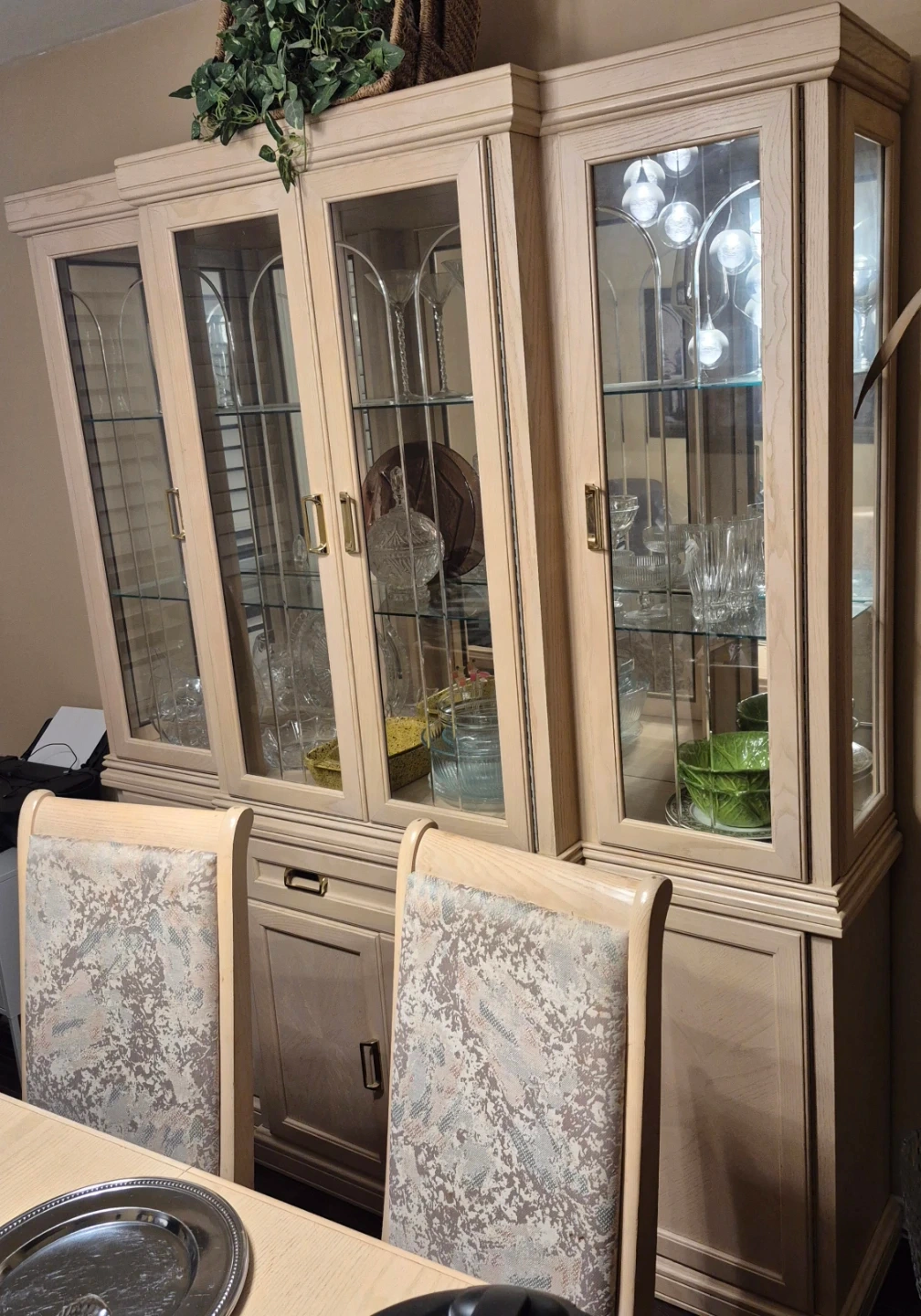 9Dining set - Wooden China Cabinet with Glass Doors Selling a lovely wooden china cabinet featuring glass doors with a matching dining table and six chairs. All is in good condition and would make a great addition to any dining room or living space.