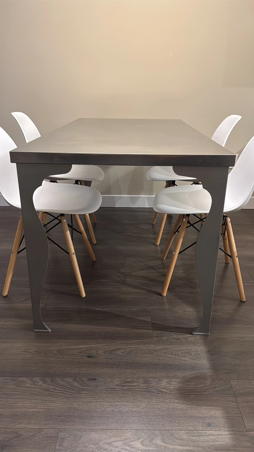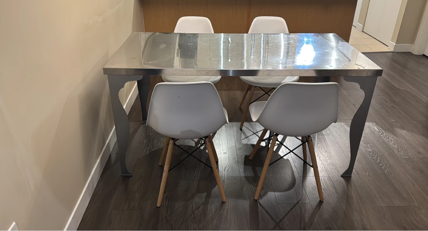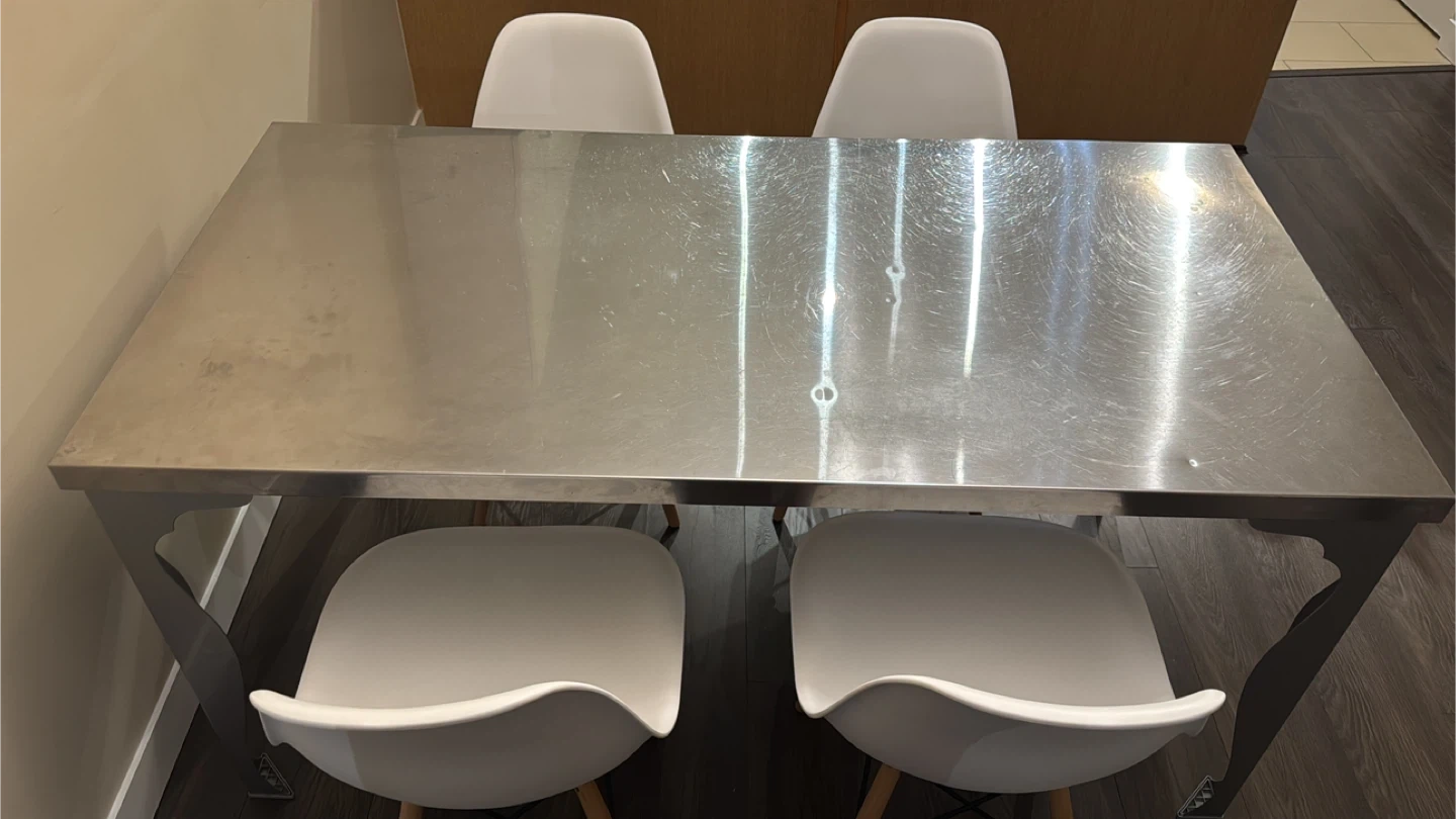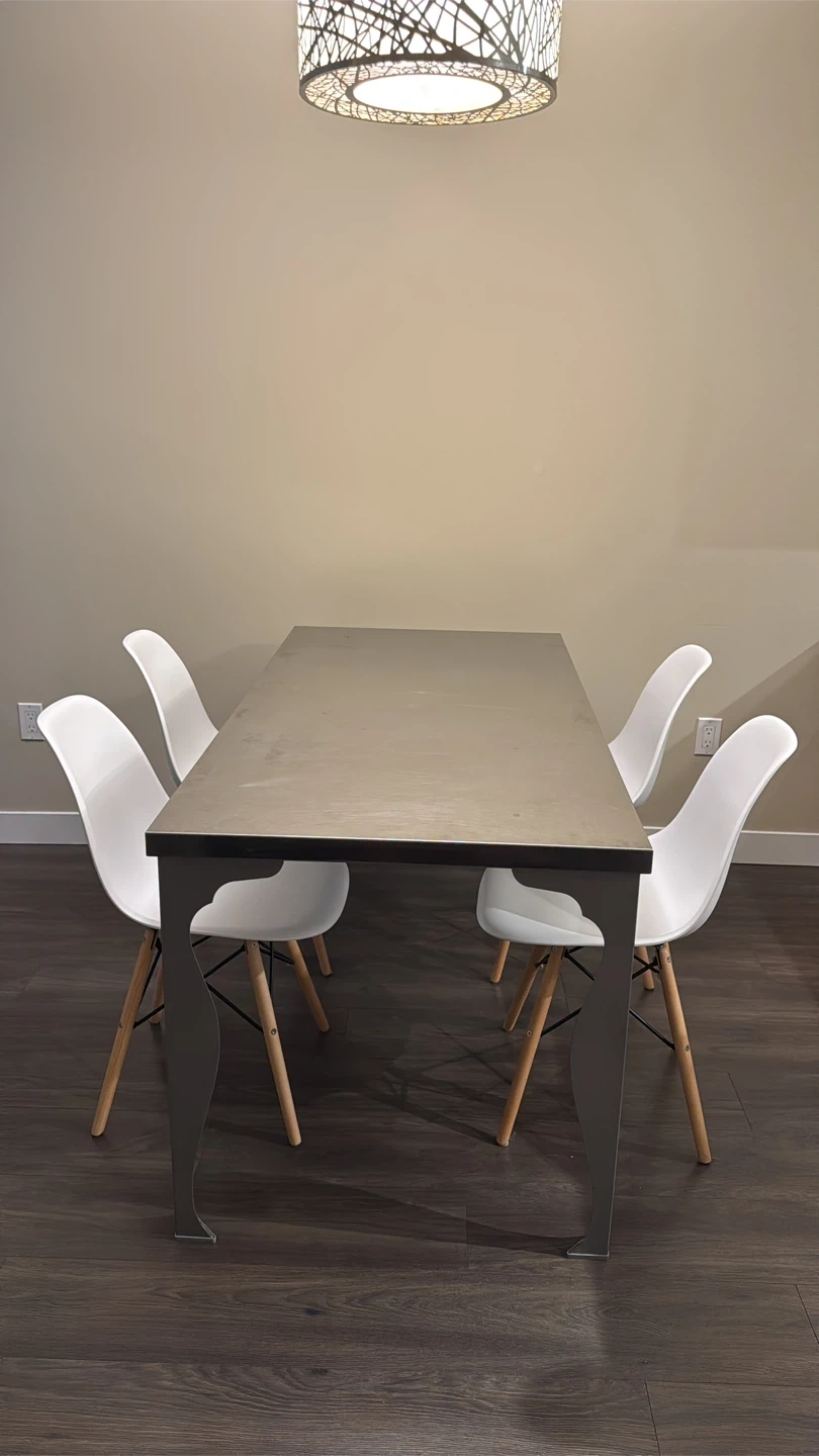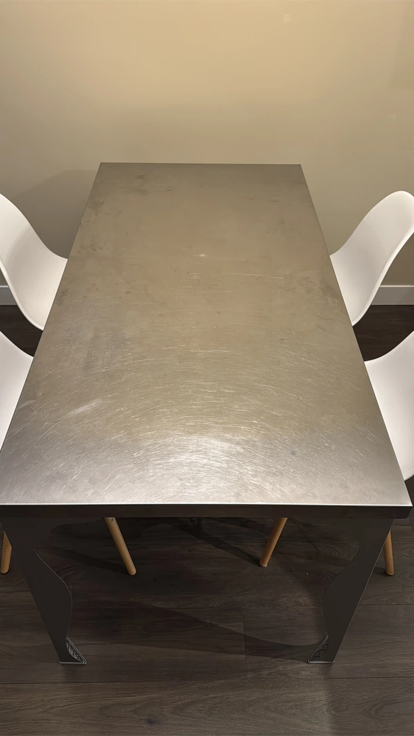 10Beautiful modern and industrial-style table with a stainless steel top and elegant metal legs. Versatile piece that can be used as a dining table, kitchen island, or office desk. Easy to assemble β the legs are attached with screws. Easy to clean and very sturdy. It has some small marks from use, giving it a unique character and personality. π Model: Vika Fintorp π·οΈ Brand: IKEA π Dimensions: 0.75 m (W) Γ 1.50 m (L) Γ 0.74 m (H) π« Chairs not included π Pickup near Cook Neighbourhood School Park in Richmond.