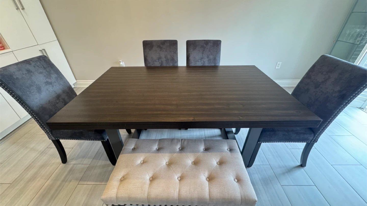 60Selling a beautiful dining table set that includes four chairs and a bench. The chairs are Dannen Upholstered Chairs in the colour slate blue (look dark grey) padded suede pebble design. The bench is Carmela Upholstered bench (it’s made for the bedroom but we used it for the table) The dining table is Minnich 38” Trestle Dining Table. Perfect for a dining room or kitchen area! All items are from Wayfair.