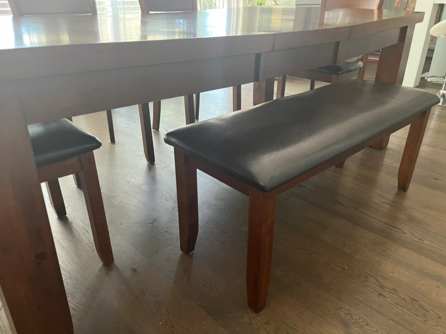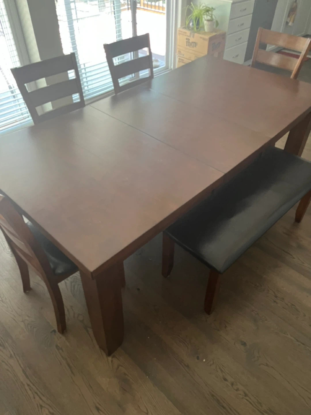 Selling a lovely dining table set! It comes with four chairs and a bench, perfect for family dinners or gatherings with friends. The set is in great condition and ready to find a new home. The colour is a beautiful brown.there is a negligible bend In table