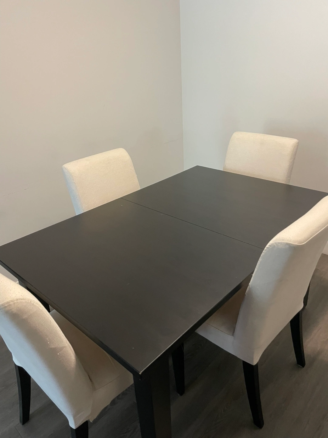 Black table and chairs for sale Table: 58 inches x 37.5 inches Does include leaf that extends the table by 22 inches Chairs have removable cover that are easy to throw in the was and clean