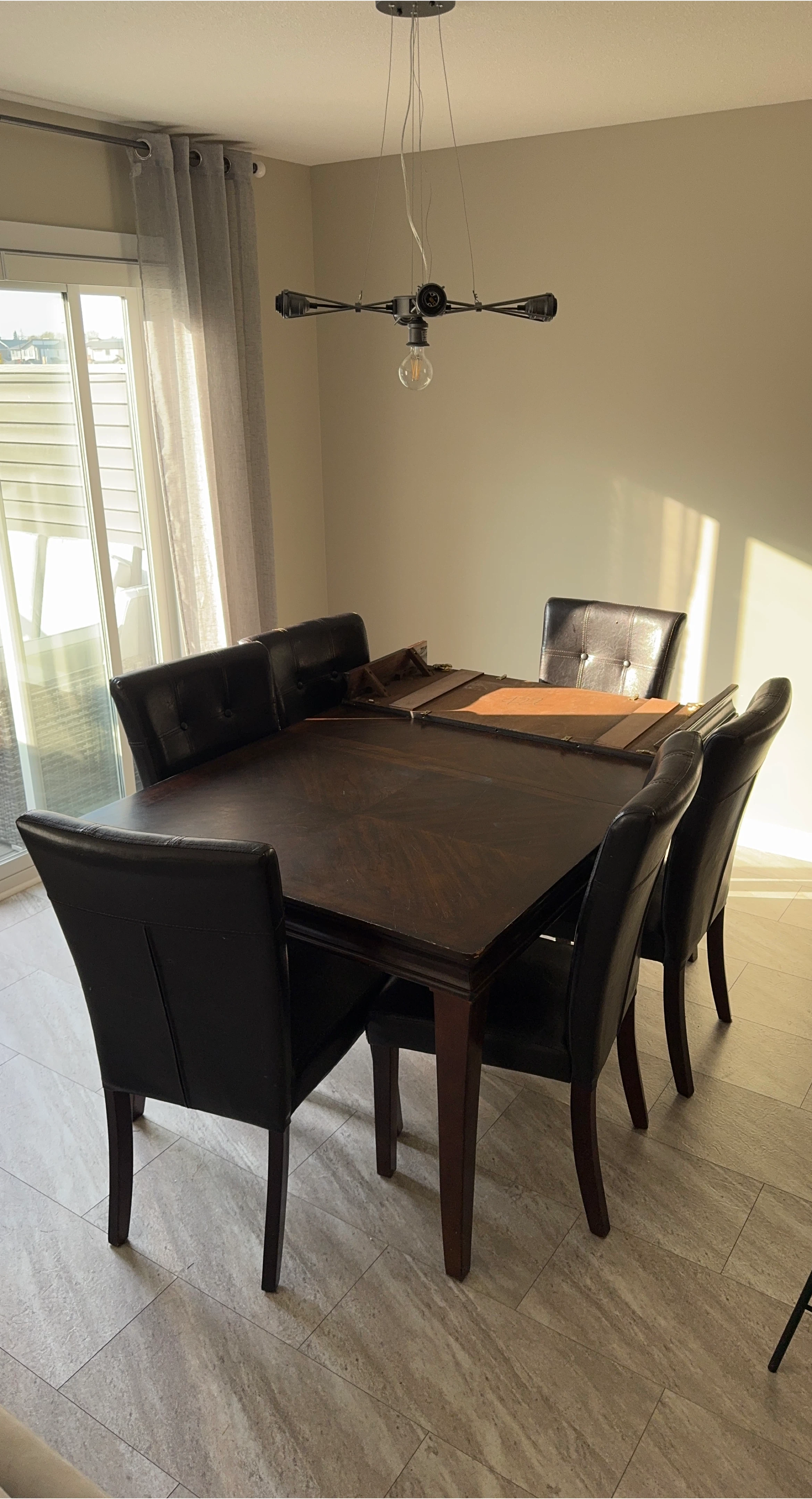 Selling a dining table with four chairs. The table is a dark wood colour and the chairs have black leather seats. It's in good condition and perfect for a small family or apartment. The table has an extension section in the middle that folds open. The chairs have a tufted design on the back.