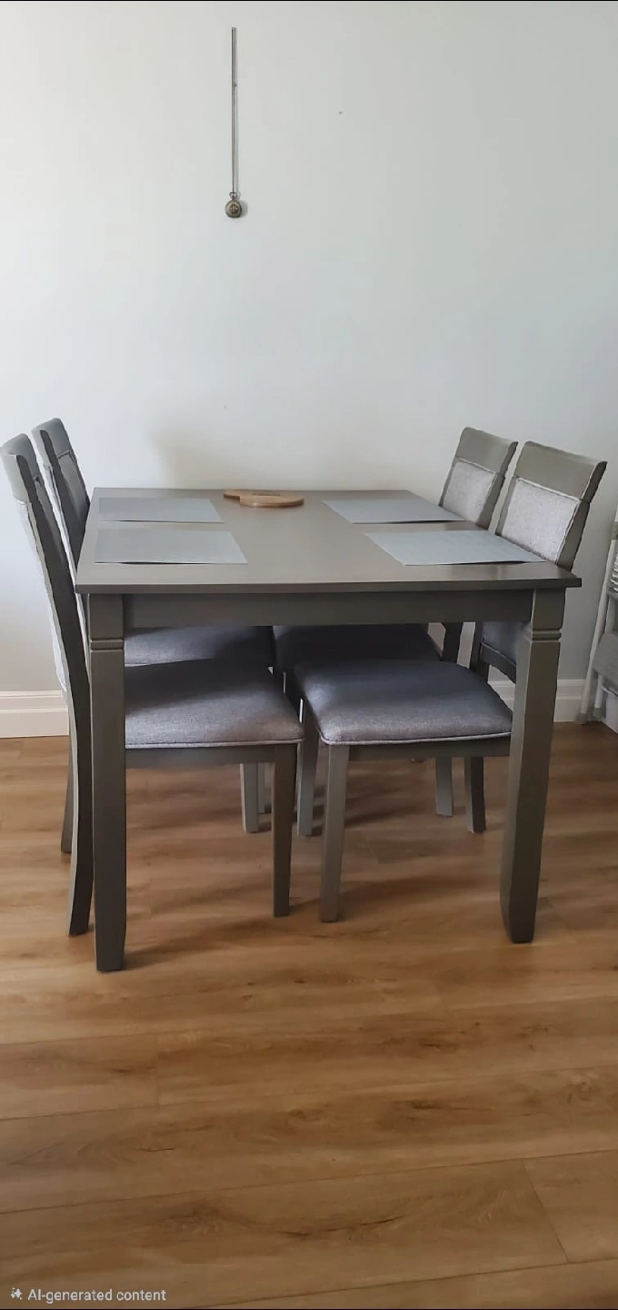 10Selling a dining table with four chairs. The set is in great condition and features a neutral grey colour that would fit well in any dining space. Perfect for a small family or apartment!