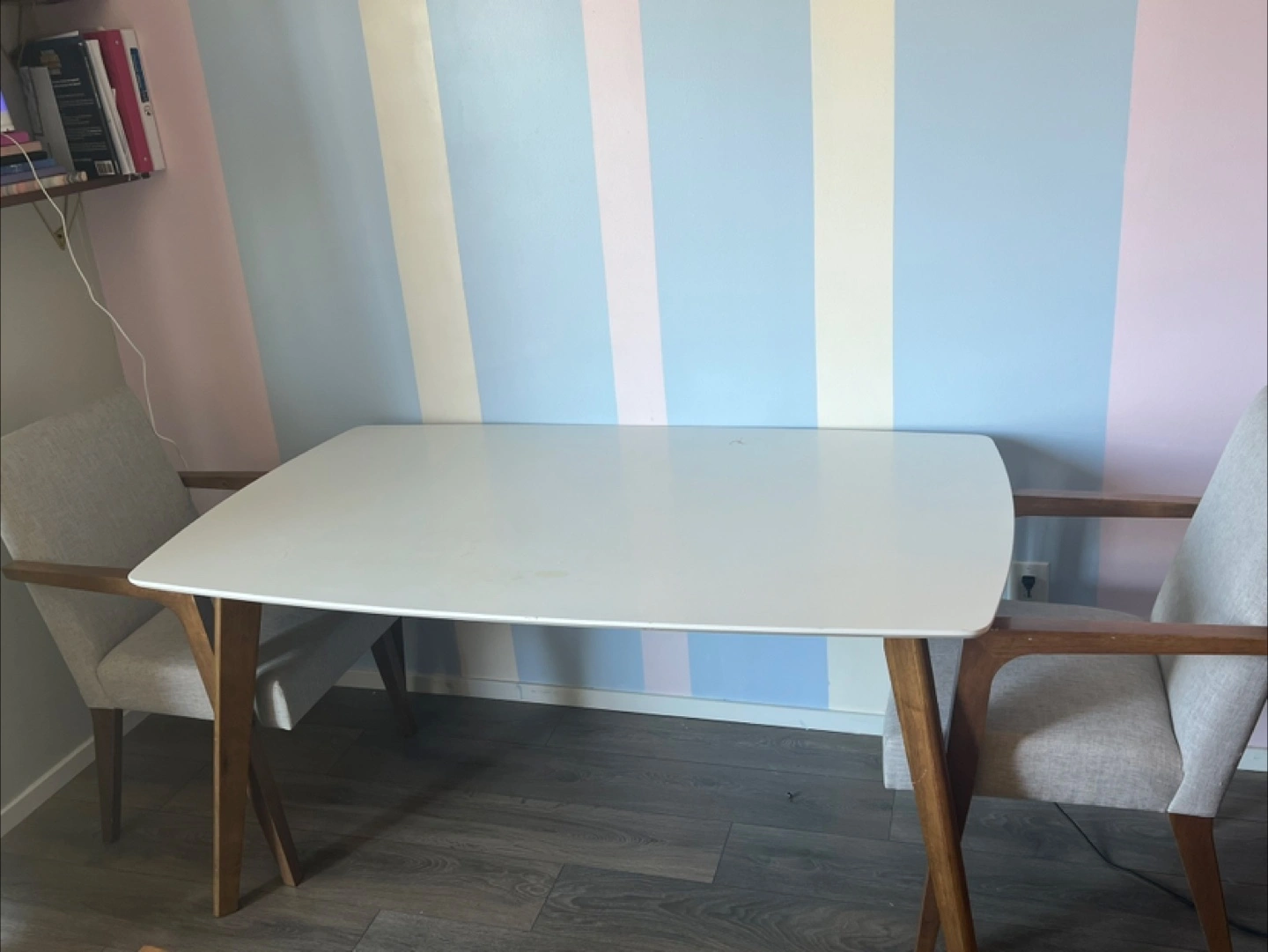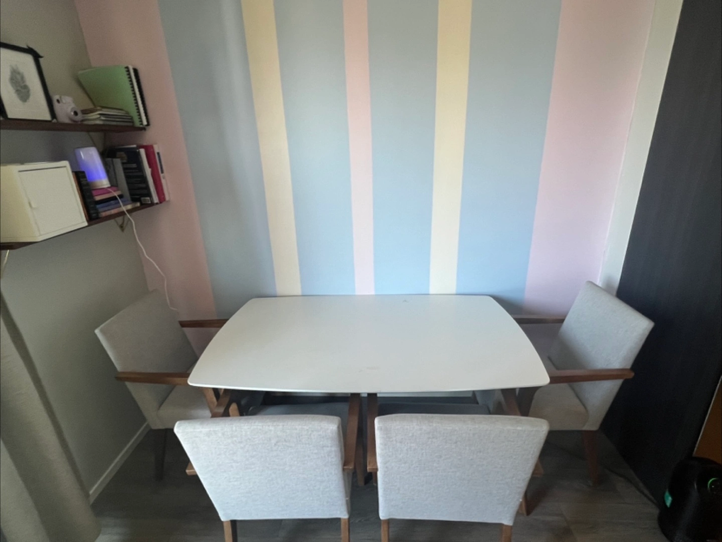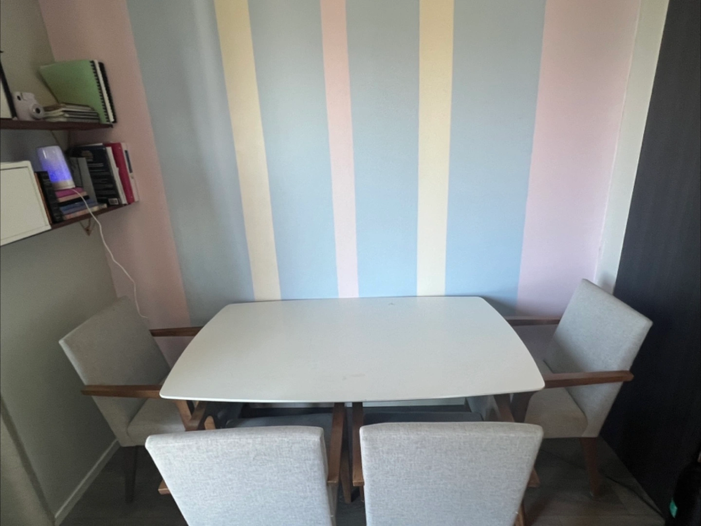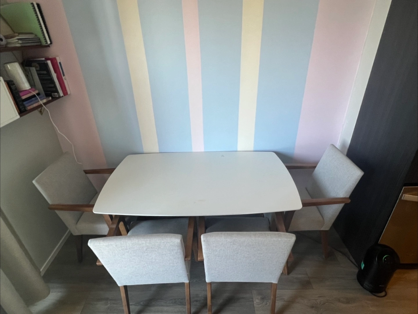 Selling a dining table with four chairs. The chairs are a light grey colour with wooden frames. The table is a square shape and white. Perfect for a dining area! Furniture can purchase as a set of 4 chairs or the table. 4 chairs - $125 Table - $65 Table and 4 Chair - $160