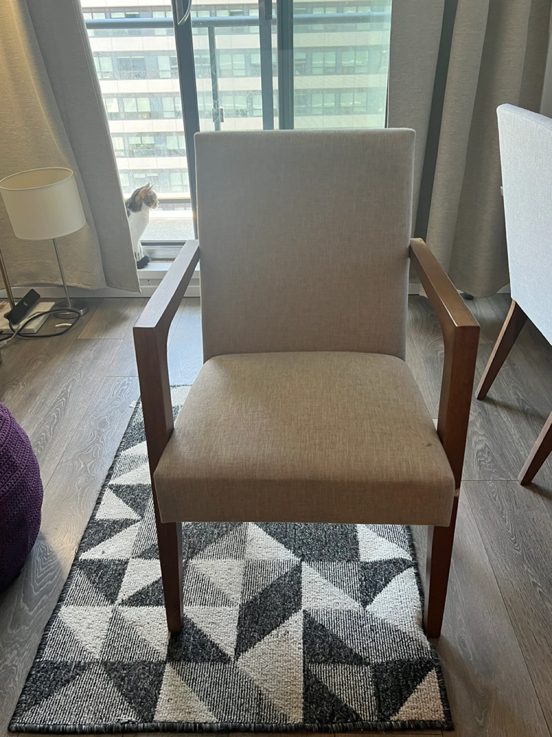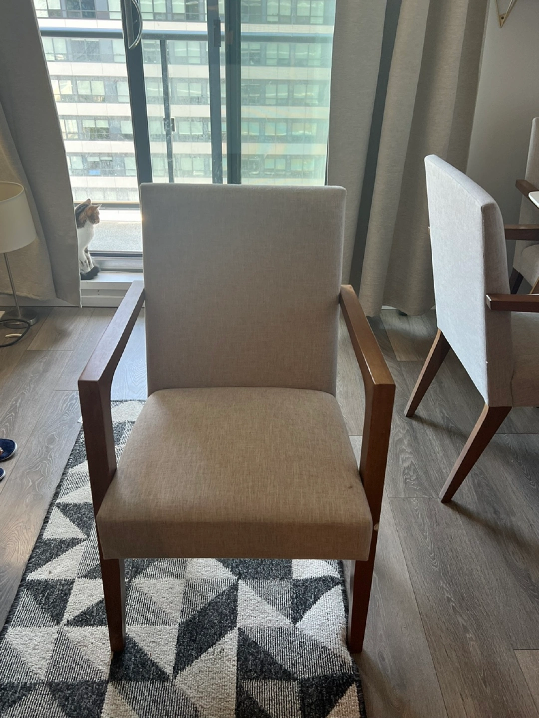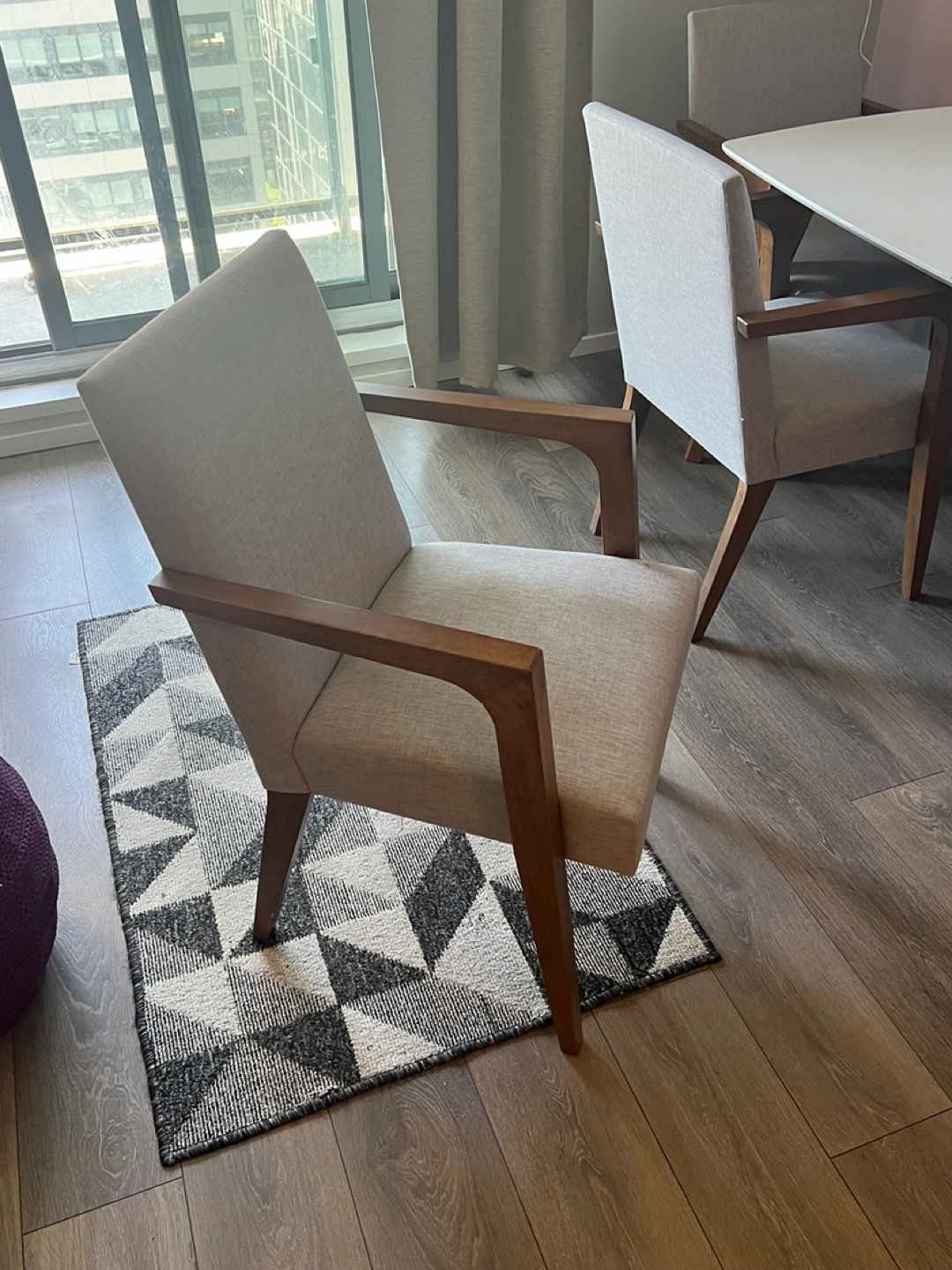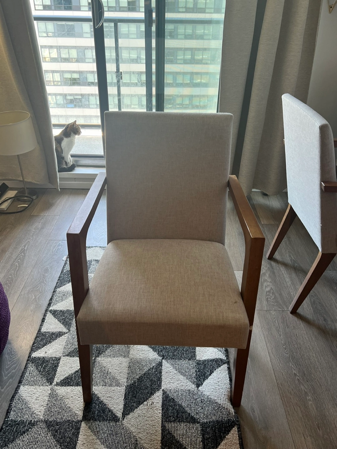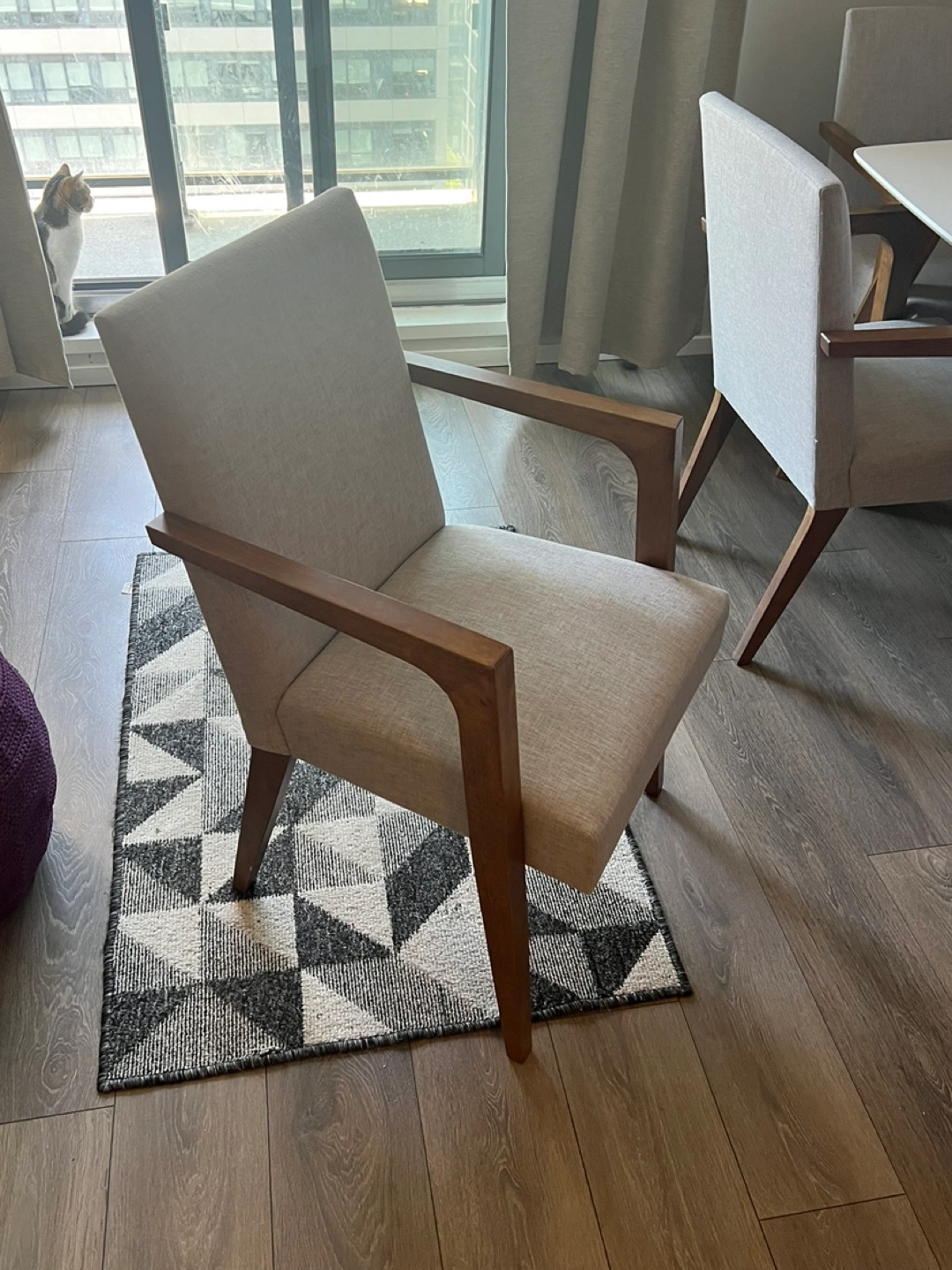 Selling a dining table with four chairs. The chairs are a light grey colour with wooden frames. The table is a square shape and white. Perfect for a dining area! Furniture can purchase as a set of 4 chairs or the table. 4 chairs - $125 Table - $65 Table and 4 Chair - $160
