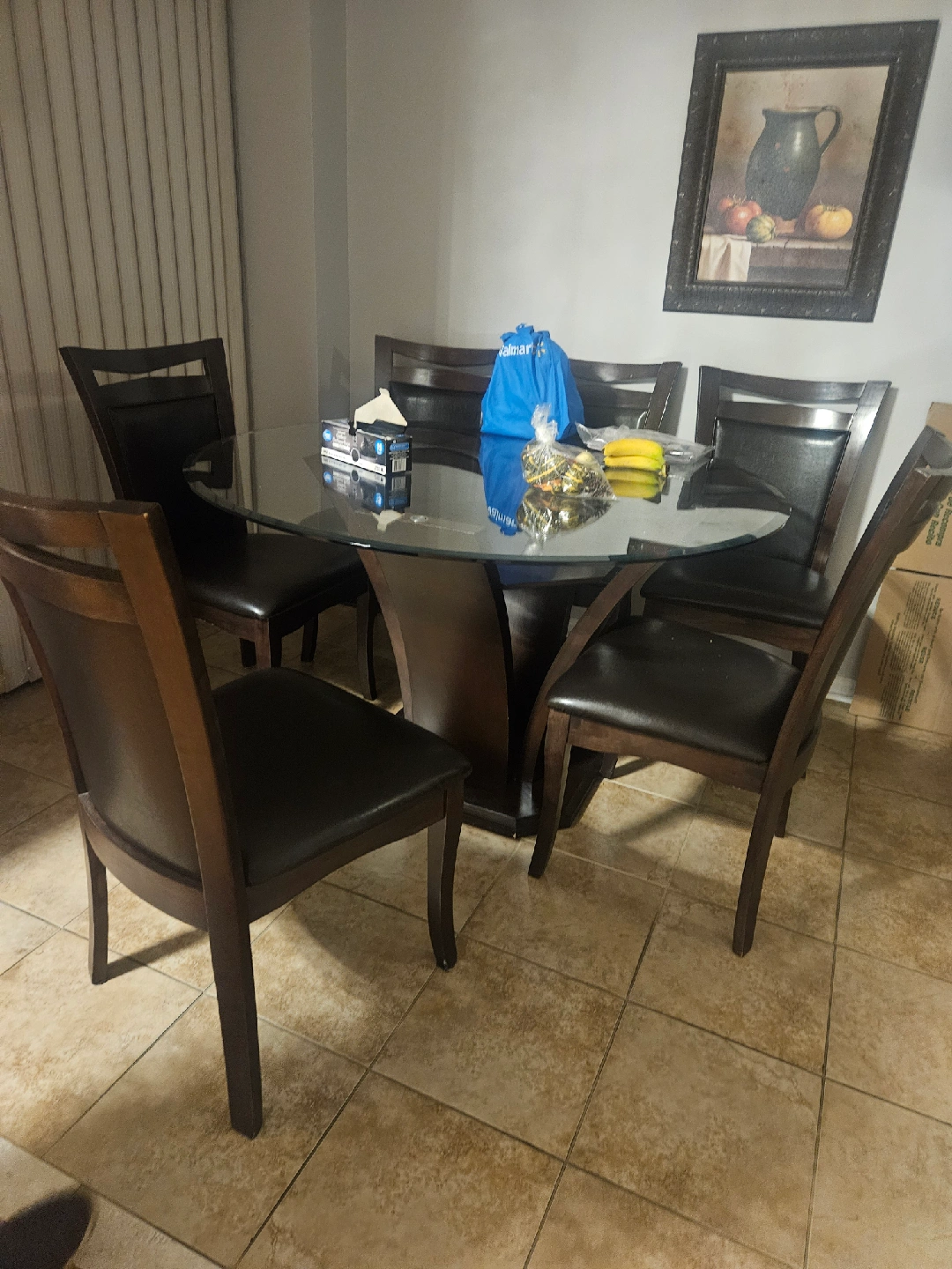 10Selling a dining table with four chairs. The table has a glass top and a dark wood base. The chairs have dark wood frames and black leather seats. It's in good condition and ready for a new home!