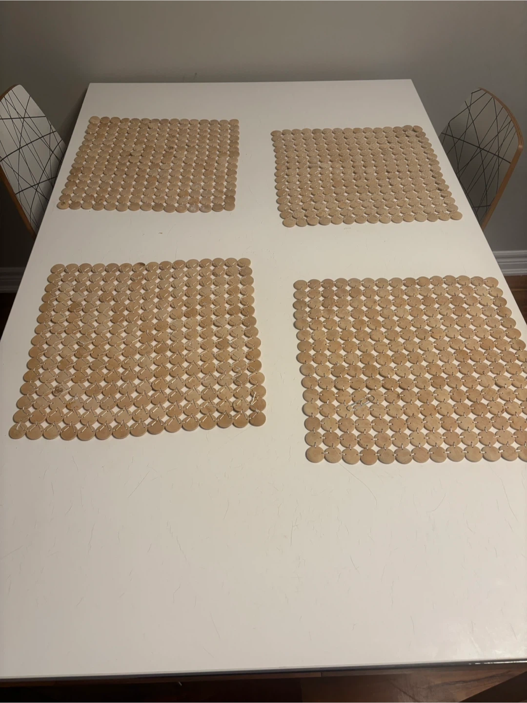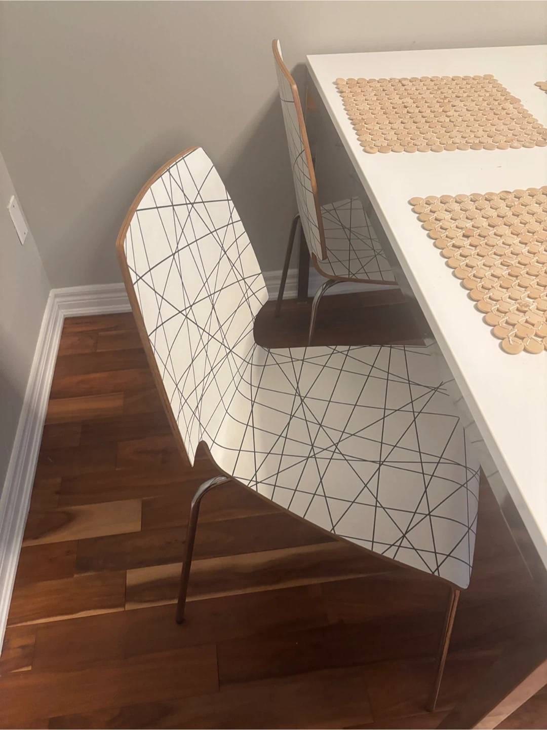 84Selling a dining table with four chairs! The table is white with a chrome frame, and the chairs have a unique geometric pattern on the back. It's a great set for a smaller dining space or kitchen nook.