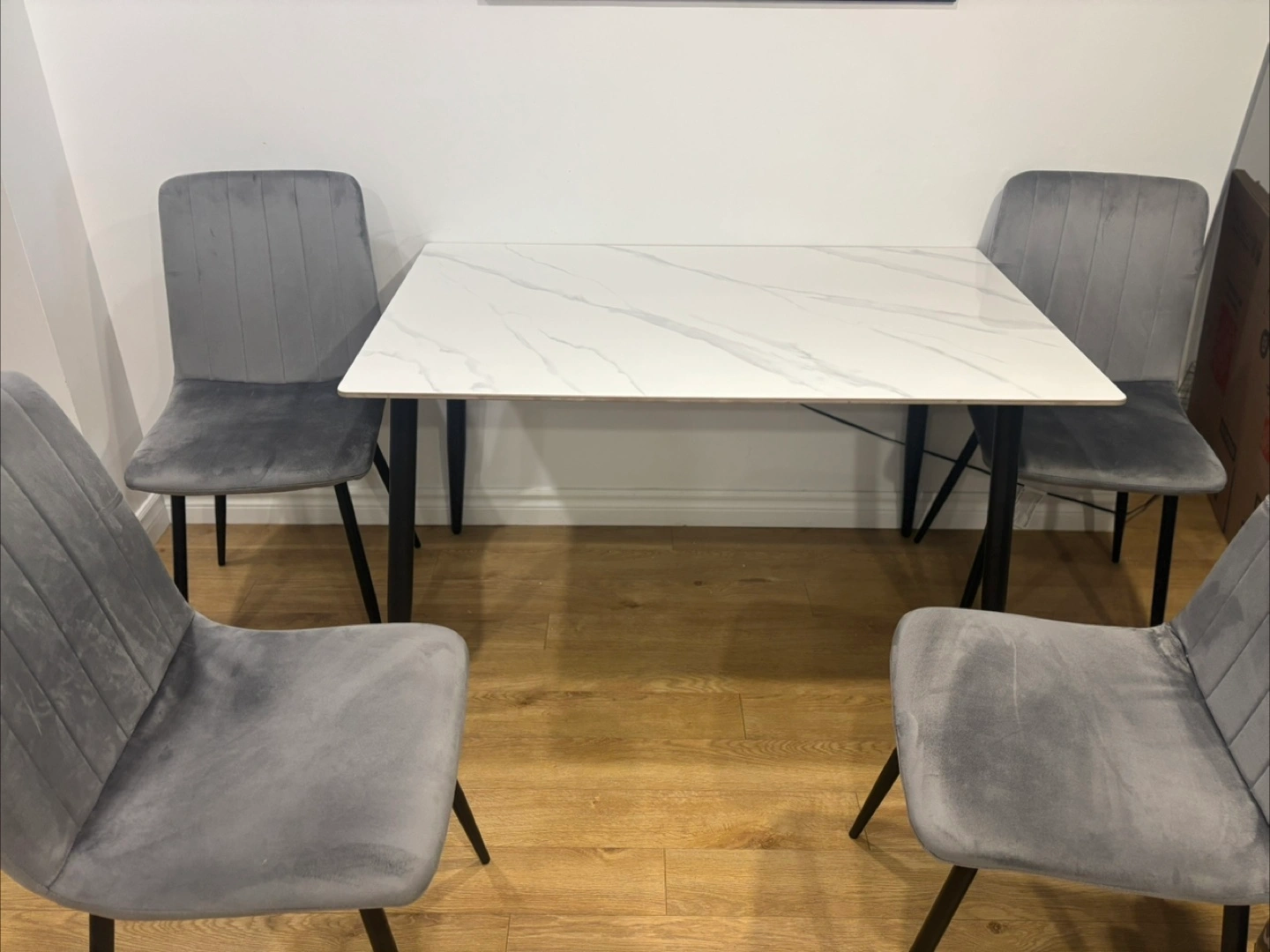 14Selling a dining table $250 + four chairs FREE The table features a white marble top and black legs. The chairs are upholstered in a grey velvet material with black legs. A stylish set for any dining room!