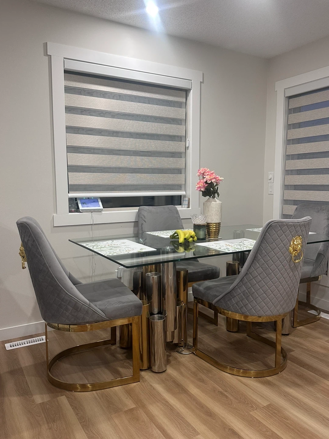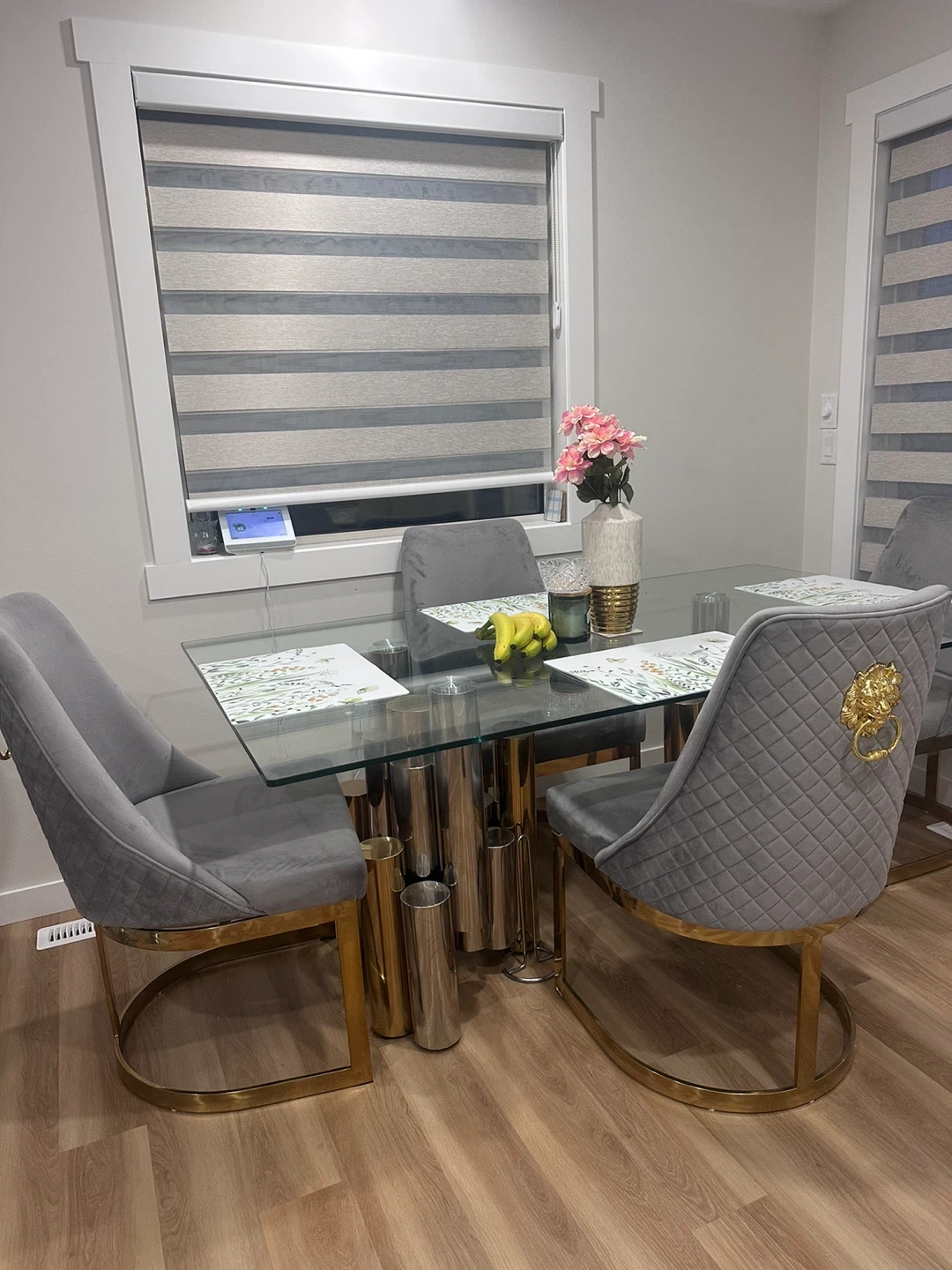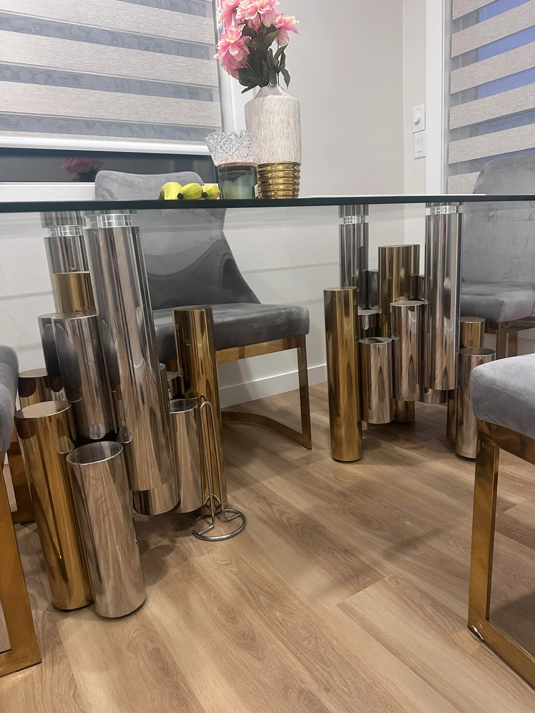 Selling a dining table with four stylish grey velvet chairs. The table features a glass top and a unique gold and silver cylindrical base. The chairs have a quilted design and gold accents, adding a touch of elegance to any dining space