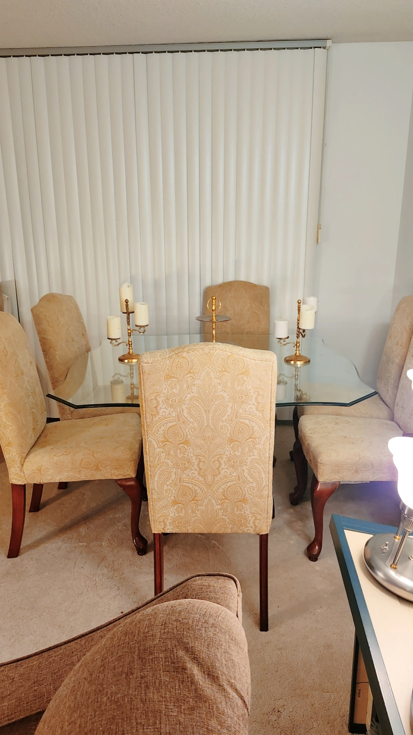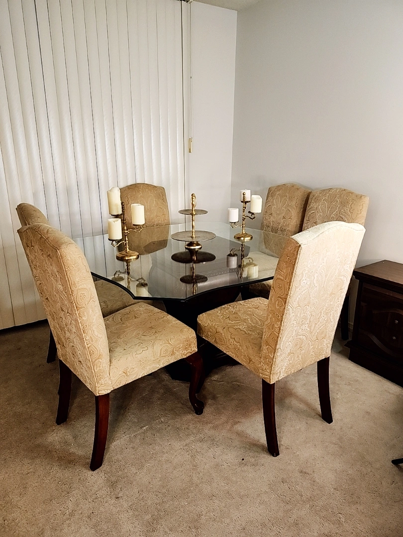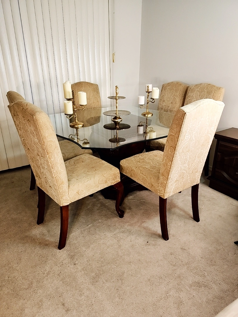 325Selling a dining table with six chairs. The table has a glass top and a decorative wood base. The chairs are upholstered in a cream- colour fabric with a subtle paisley pattern. The set is in very good condition and would be a great addition to any dining room. $ 400, Dining table $210, 6 chairs $600 Dining table and chairs 54"×54" x pickup near Yonge and Sheppard