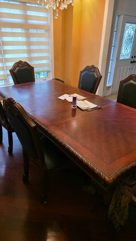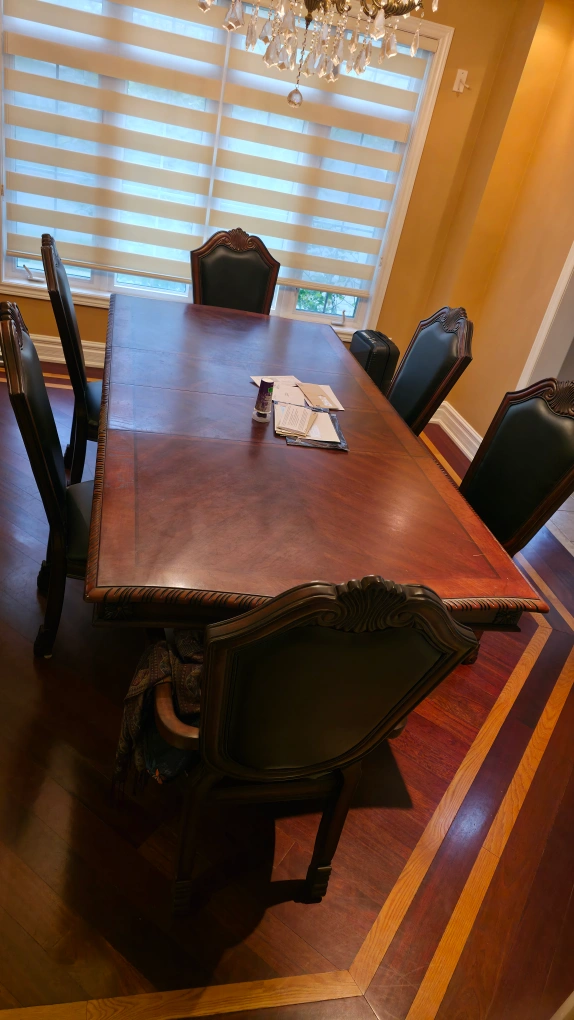 24Selling a dining table with six chairs. It's in great condition. Strong and solid wood in Dark Brown. This is extendable table, the photos posted is in full length. It is fully disassembled so it will be easy pick up. Please arrange pickup.