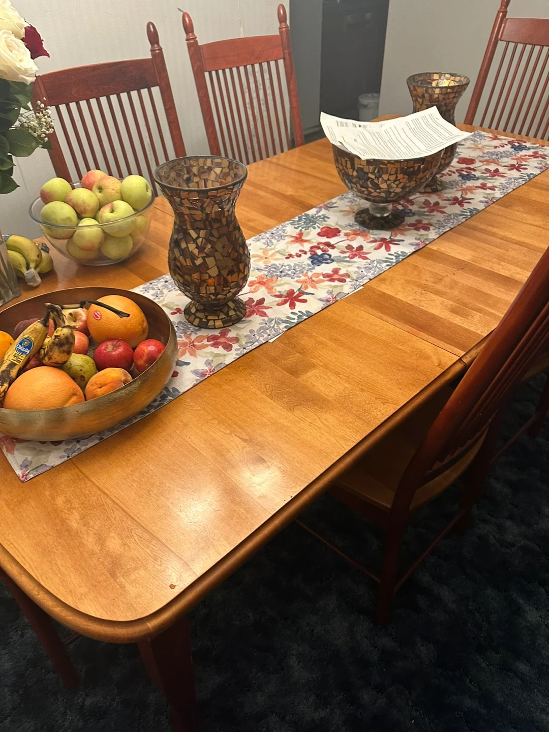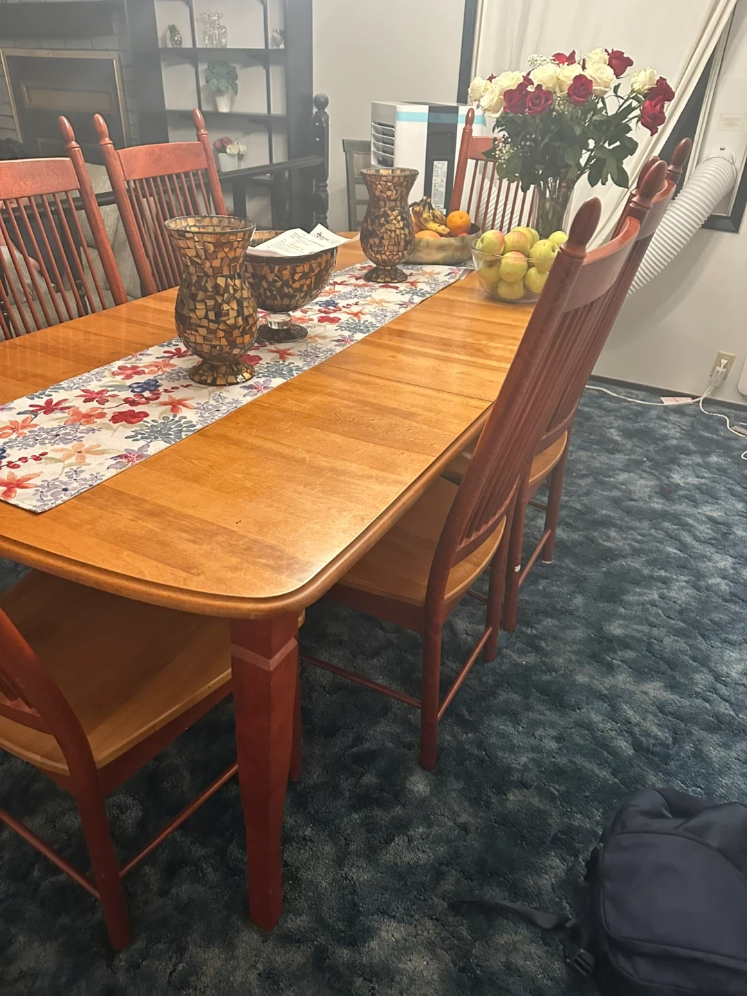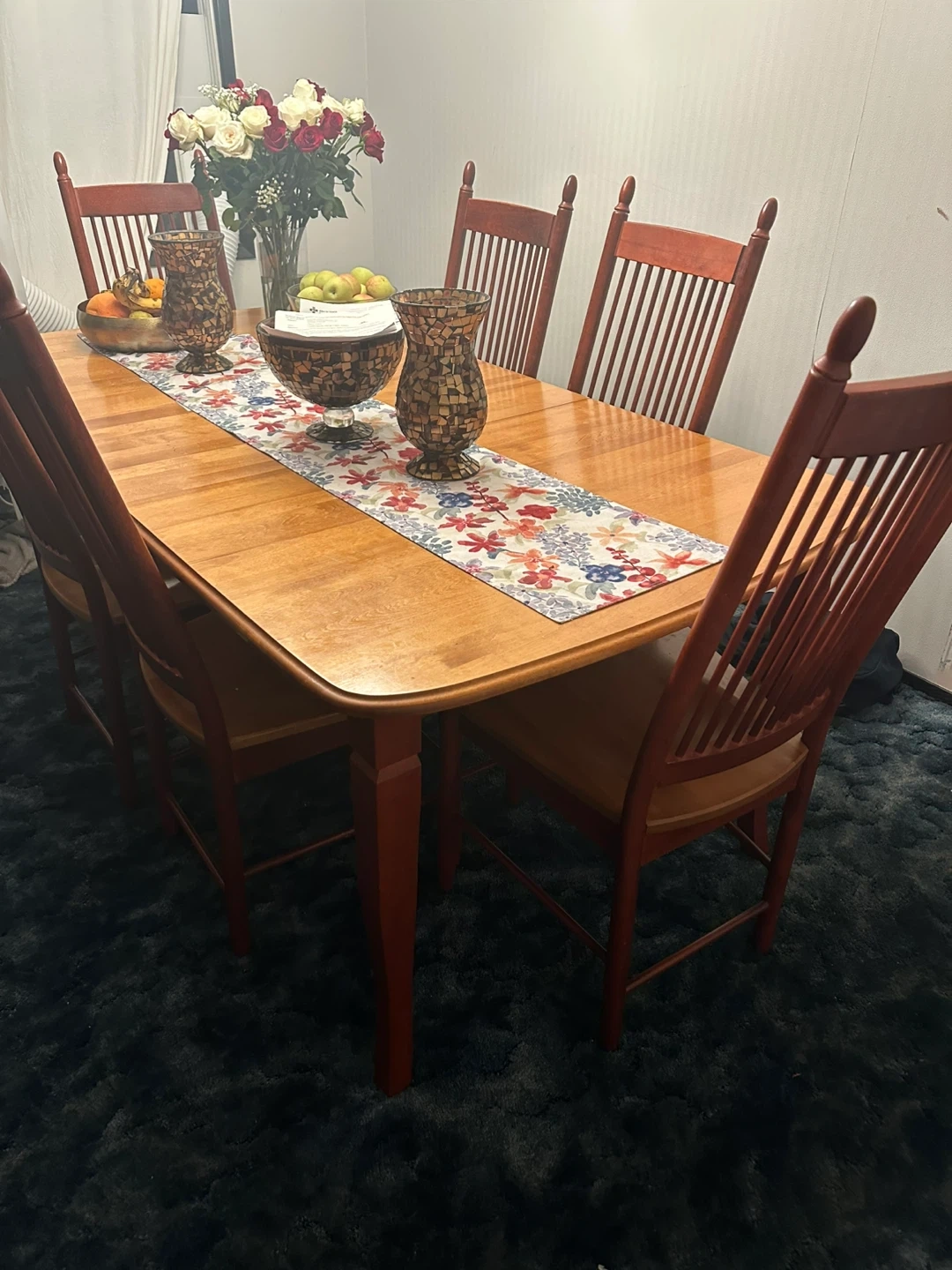 Selling a dining table with six chairs. The set is in good condition and ready to find a new home. Perfect for family dinners or gatherings with friends! The table has a warm, inviting colour.