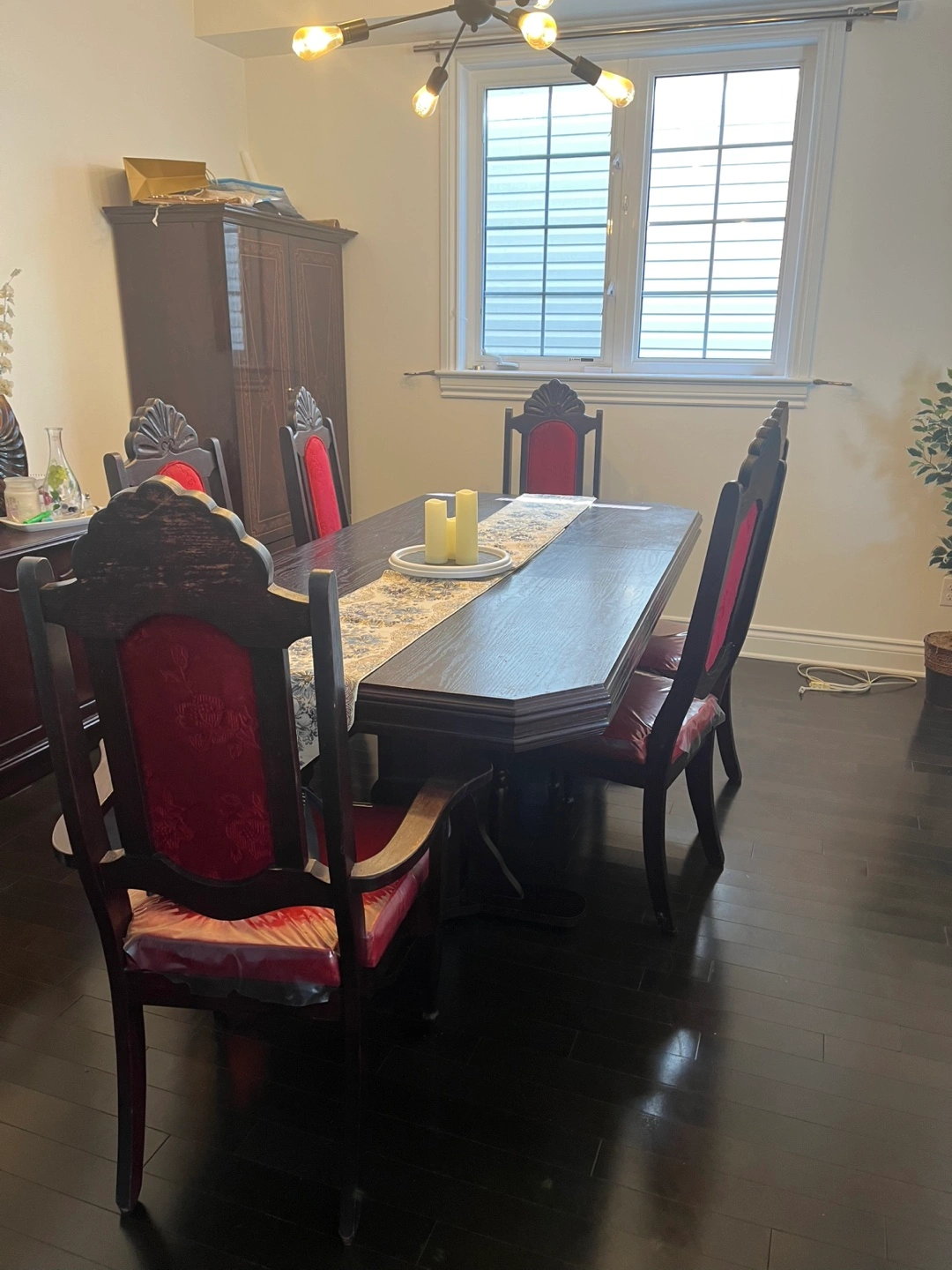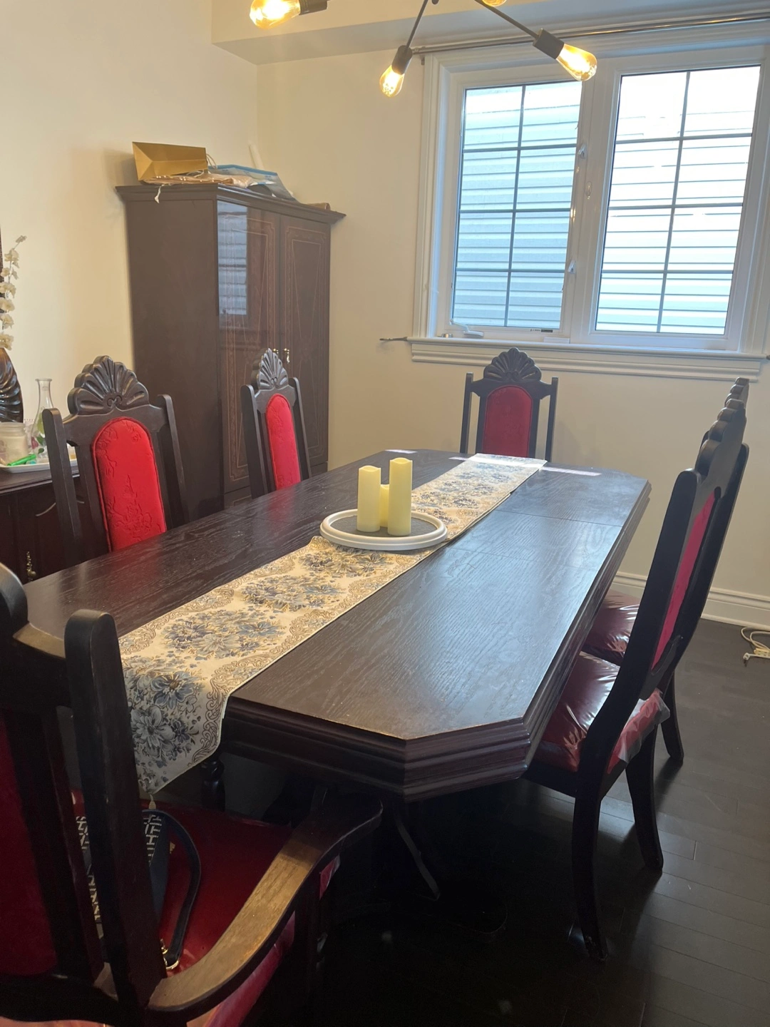 Selling a dining table with six chairs. The table is a dark wood colour, and the chairs have red upholstery. It's a great set for family dinners or gatherings with friends. The table has a unique design with an octagonal shape.