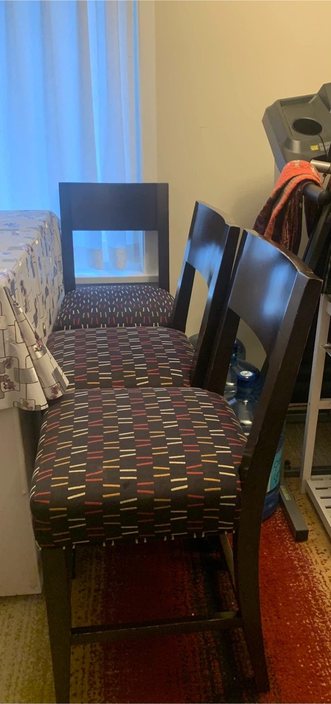 10Selling a dining table with four chairs. The chairs have a dark wood frame and patterned cushions. The table is a good size for a small dining area or kitchen. It’s very great condition each $15 $120/6 chairs
