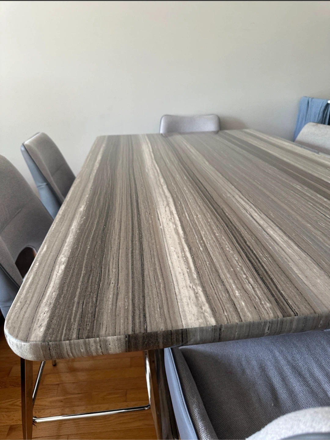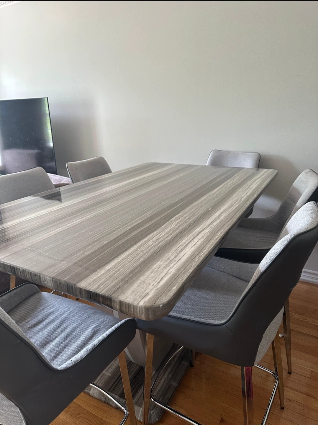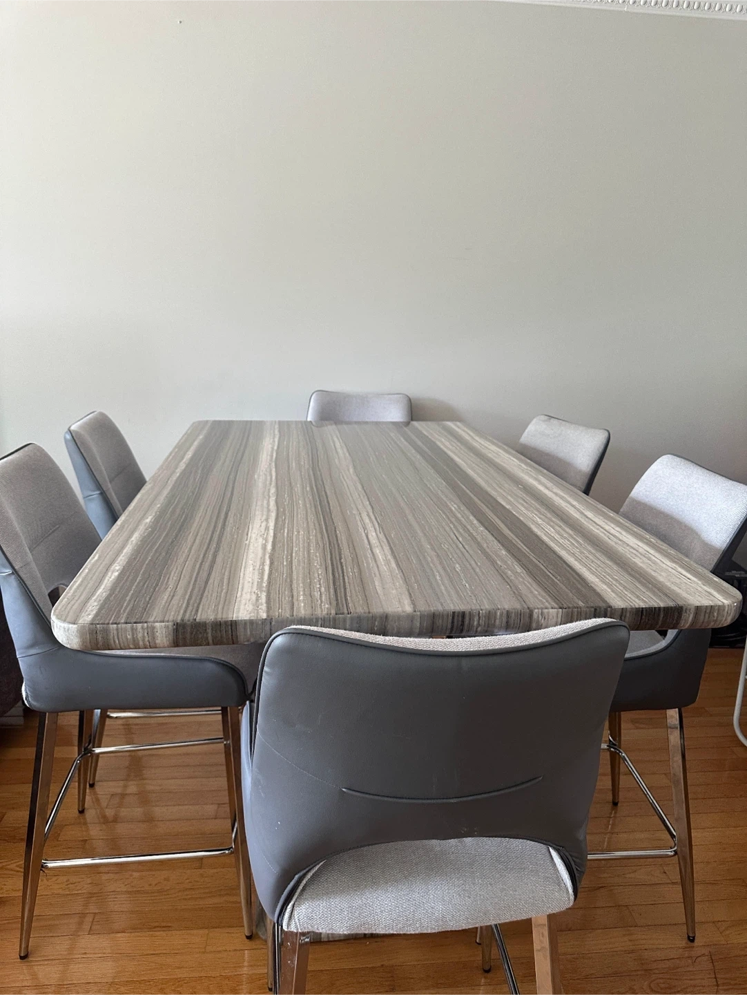 Selling a dining table with six chairs. The table has a unique striped pattern on the top, and the chairs are a stylish grey colour. It's in great condition and ready to be the centrepiece of your dining room! Contact for price, open for negotiation
