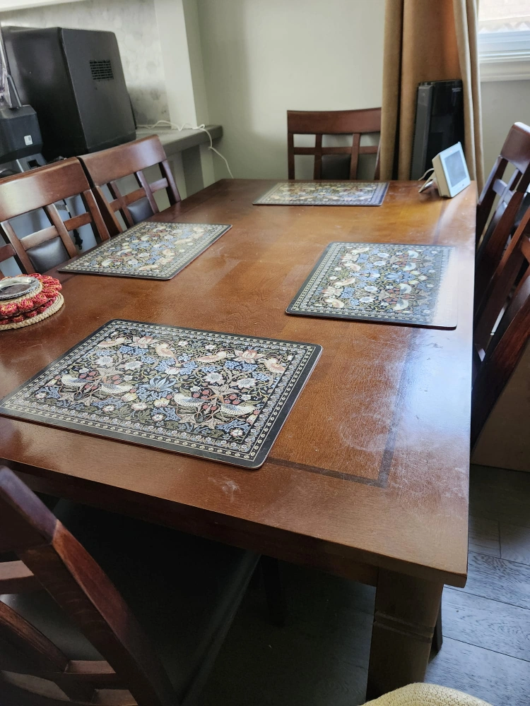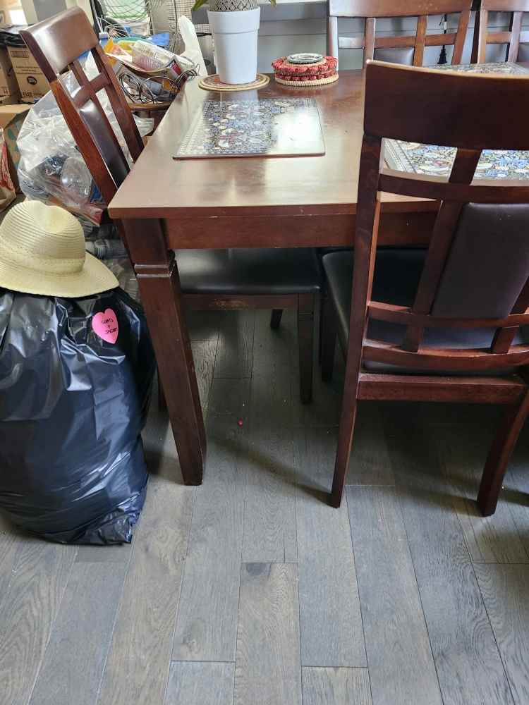 40Selling a dining table with six chairs. Good used condition, no damage and only minimal wear. Only selling because a dining table was included in our new place and we don't have room for this one. Great for smaller spaces. Priced to sell. L 59" W 36"